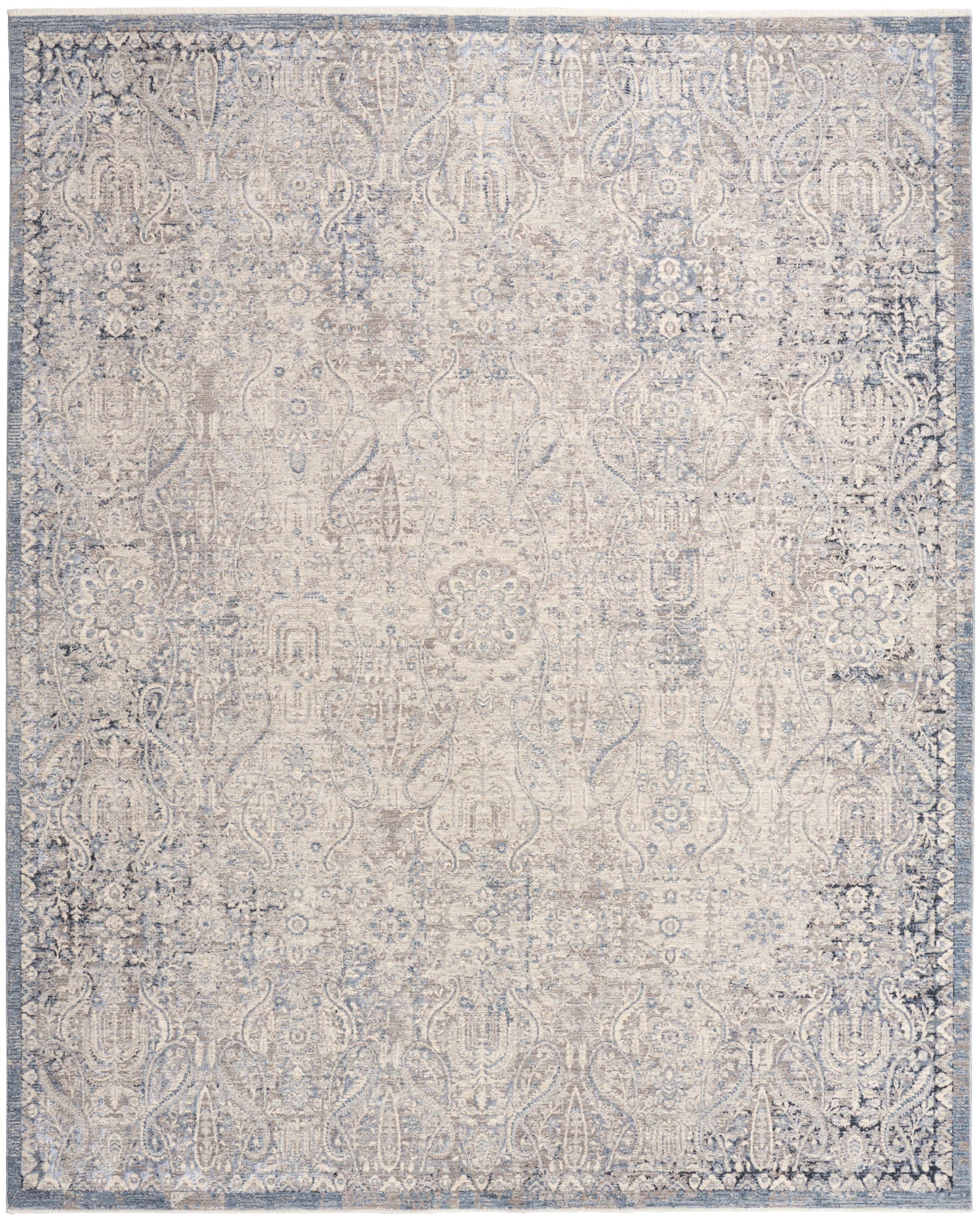 Description: Transform any room into a cozy retreat with this vintage-style grey and blue rug from the Delphine collection. The intricate floral and vine details paired with a lush pile softens bare floors, while the short fringe edges add character.