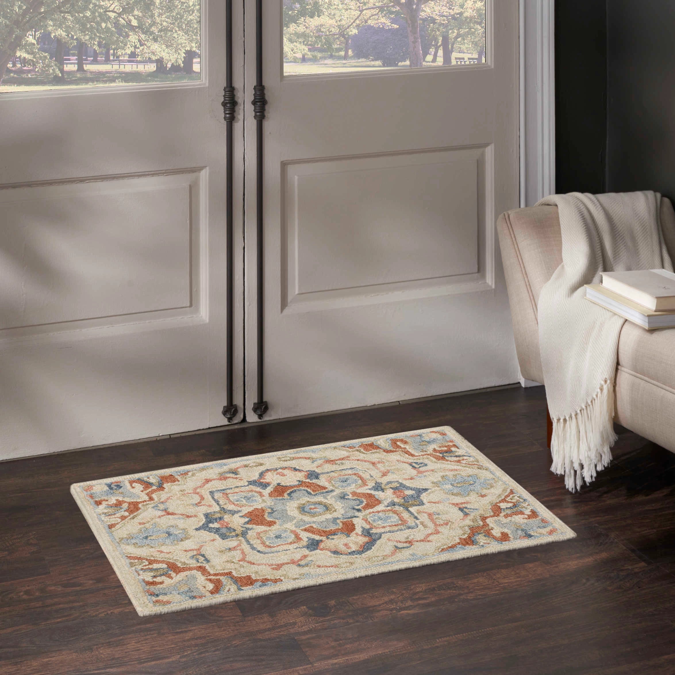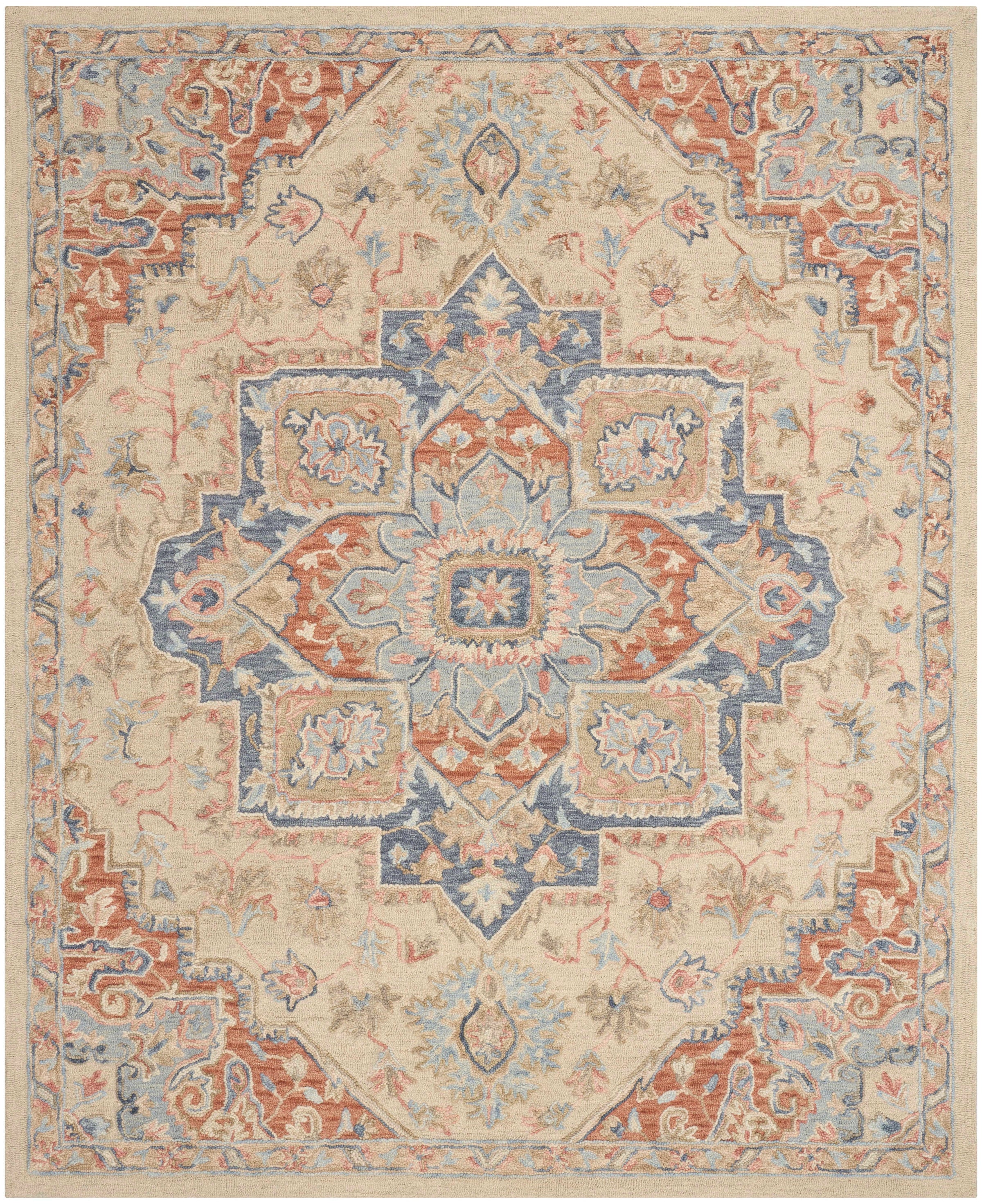Description: Equal parts charming and classic, this ivory and rust Persian-style rug from the Goldie collection adds character to any room. Handmade from 100% wool, its tufted with a high-low pile that adds subtle depth to living rooms and bedrooms alike.