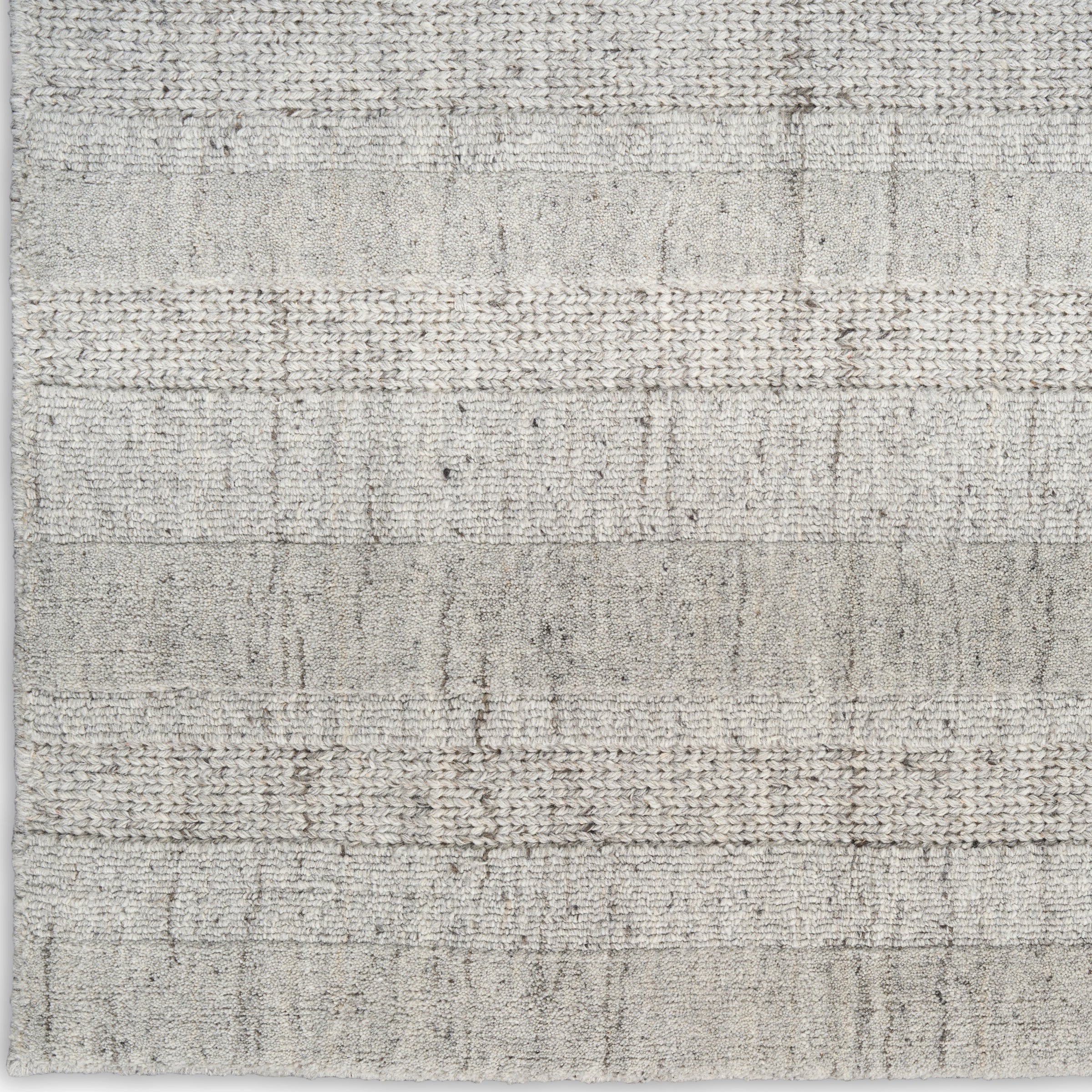 Description: Bring relaxed energy to your space with this textured stripe rug from the Martha Multi Weave collection. The interplay of mixed weaving techniques and soft tonal variations invite a sense of depth, creating a cozy atmosphere thats perfect for unwinding after a long day. Handmade from a wool-poly fiber blend in grey.