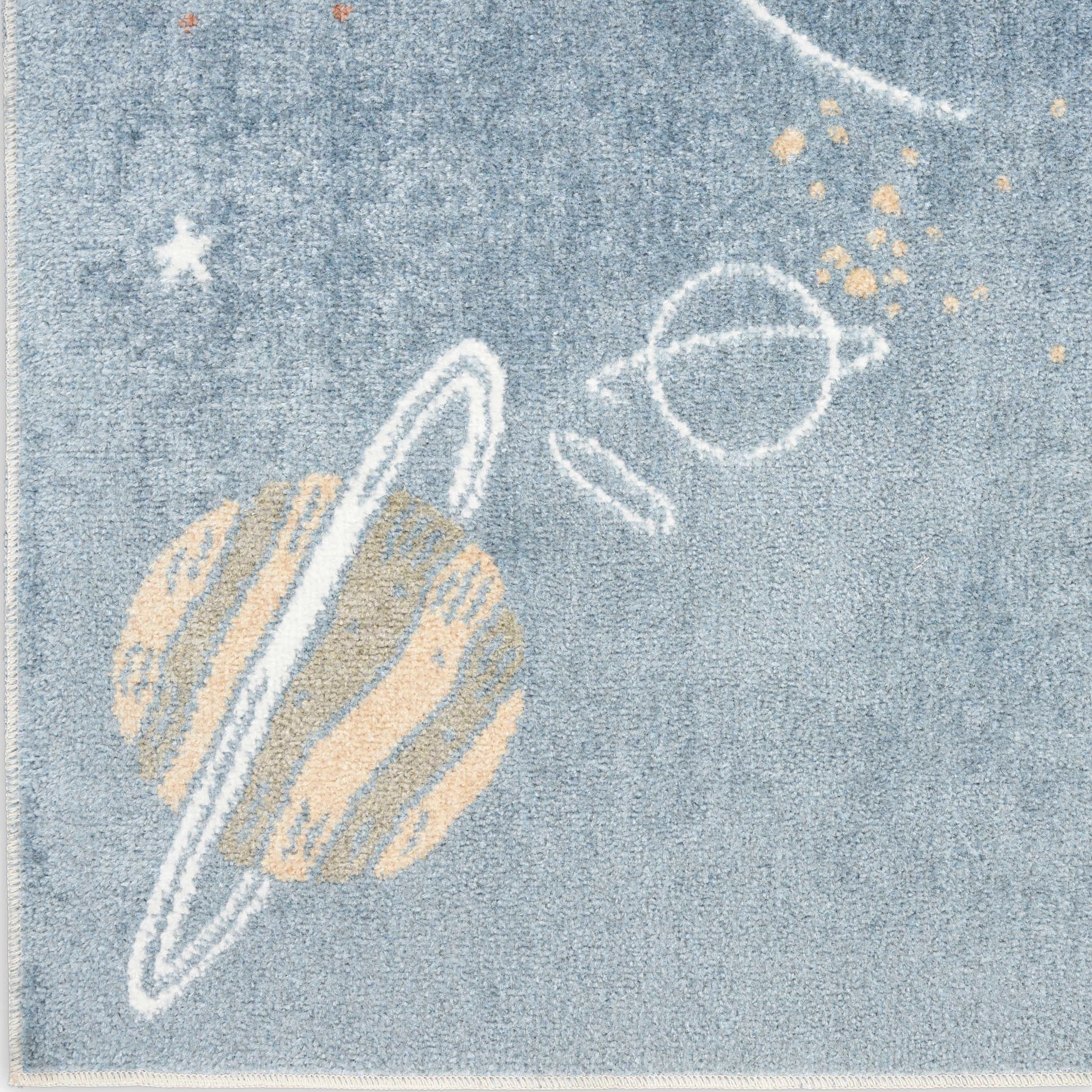 Description: Fuel your childs love for imaginative play with this blue kids rug from the Rocket Machine Washable Collection. The repeat rocket and planet design is finished with a brilliant shimmer that adds a fun pop of color to a playroom, nursery, or kids bedroom. Cleaning up accidents is a breeze simply toss the rug into the washing machine on cold and air dry. OEKO-TEX certified.