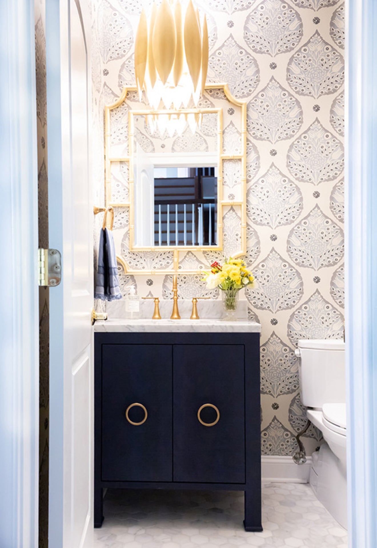 Description: You'll want to design your bath or powder room around the high style material palette of our Constance Bath Vanity. Dressed in textured navy linen and antique brass ring pulls, Constance is an artful combination of color and texture. Includes a luminous white with grey accents Carrara marble top & backsplash plus a white porcelain sink.