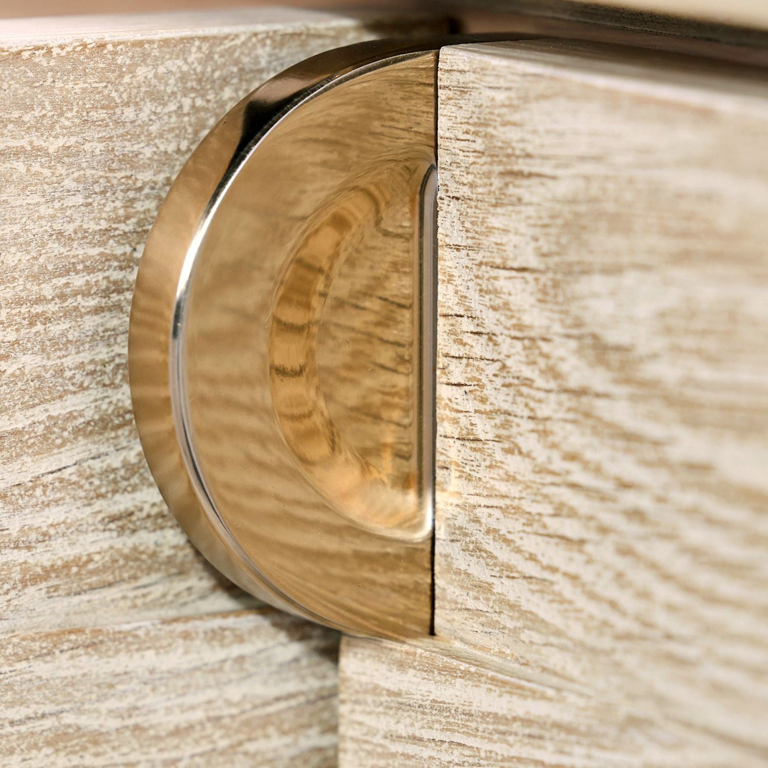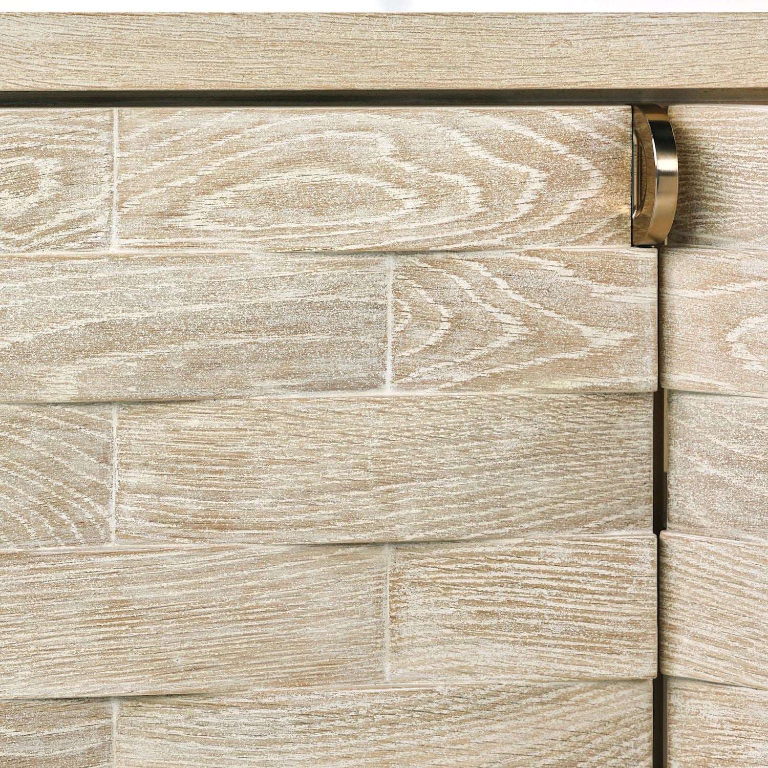 Description: The Tasha Credenza contributes a stunning sense of depth and dimension to an interior space. Crafted from Limed Oak wood, the piece showcases a gorgeous weave pattern across four doors with subtle steel hardware in White Brass. The piece features three interior compartments, each with a single adjustable shelf.