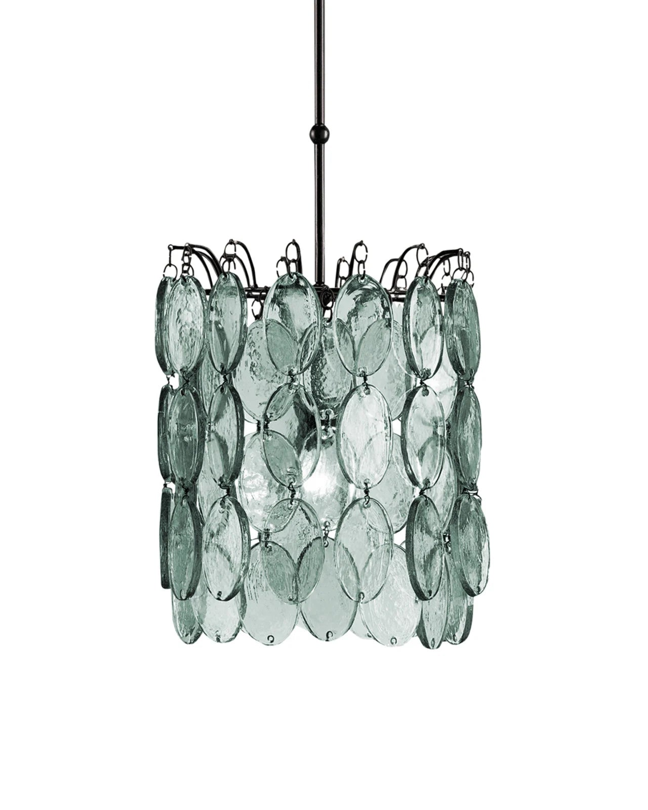 Description: Recycled glass discs arranged in a cascade form the shade of the Airlie Pendant, the intersecting lozenges diffusing the light through a mottled mosaic. Wrought iron is crafted by skilled artisans to create the frame of this glass pendant, which is hand-finished in satin black.