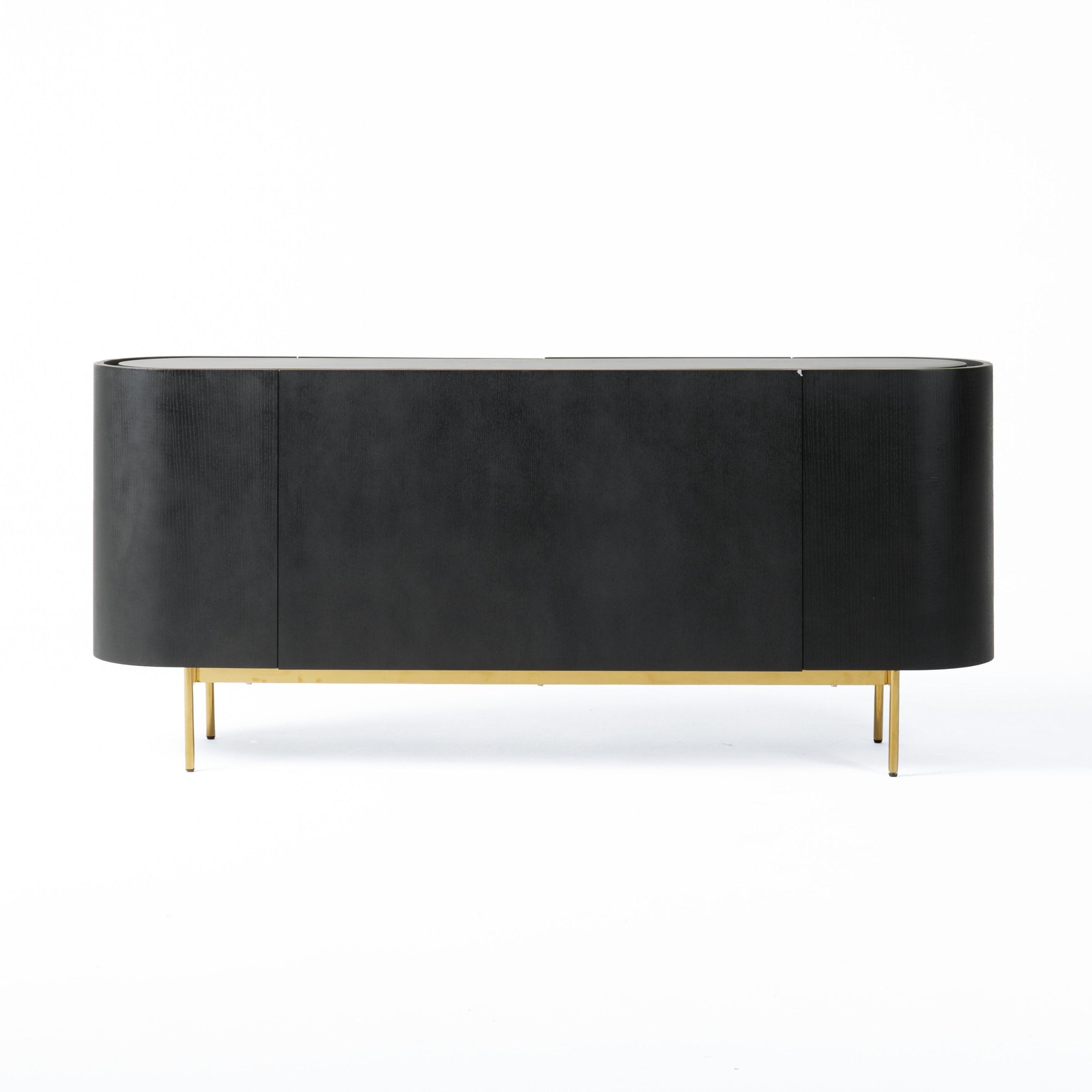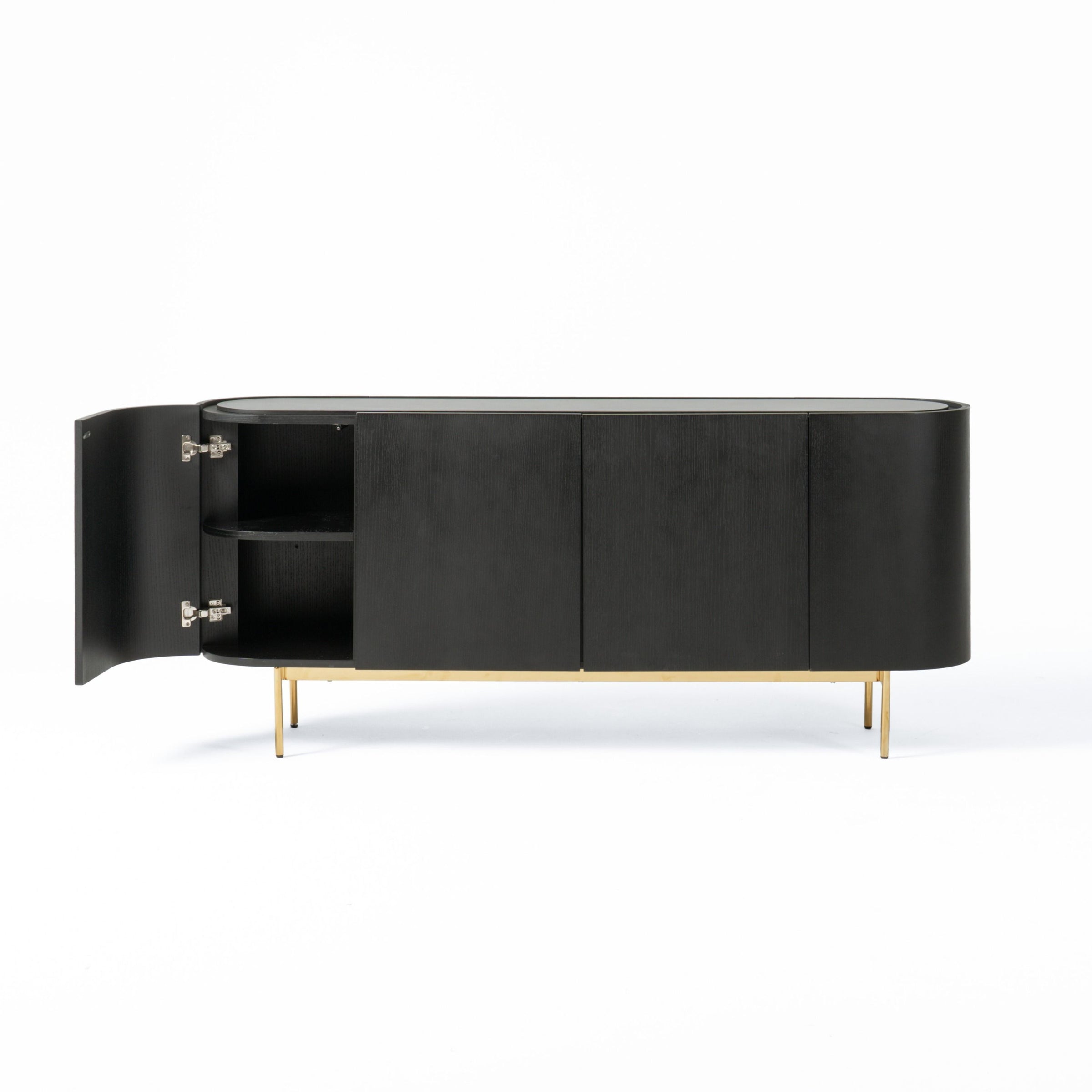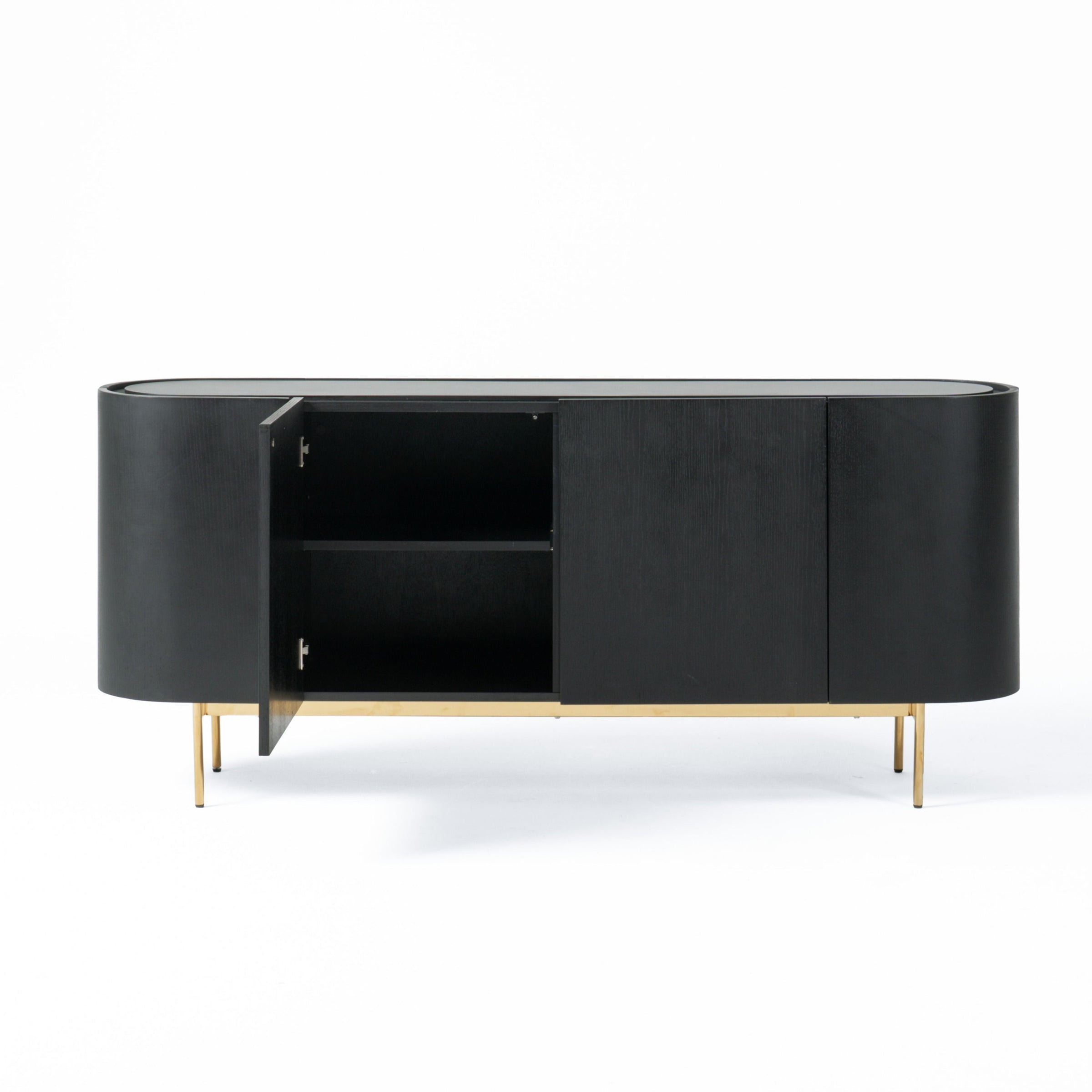 Description: The Anita Sideboard-Buffet will make a wonderful addition to your dining room! It combines the three elements of good taste: attractive to the eye, made with excellent quality materials and multi functional. The Black Oak Veneer & Black Matte Top finish bring a modern and elegant aesthetic to the room and the combination of sliding and cabinet provide ample space for your dining accessories such as platters, glassware and more. The Anita collection includes a matching TV stand perfect for your living room.