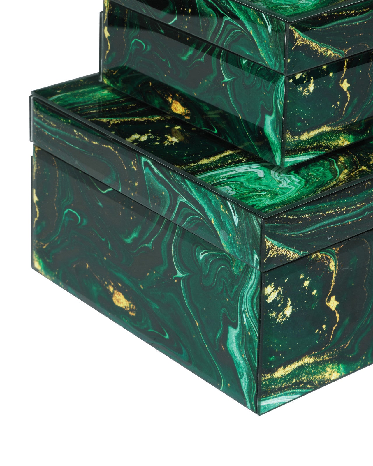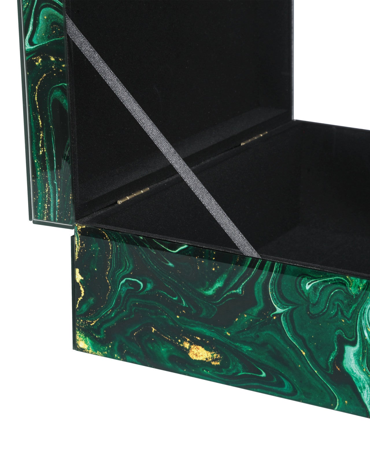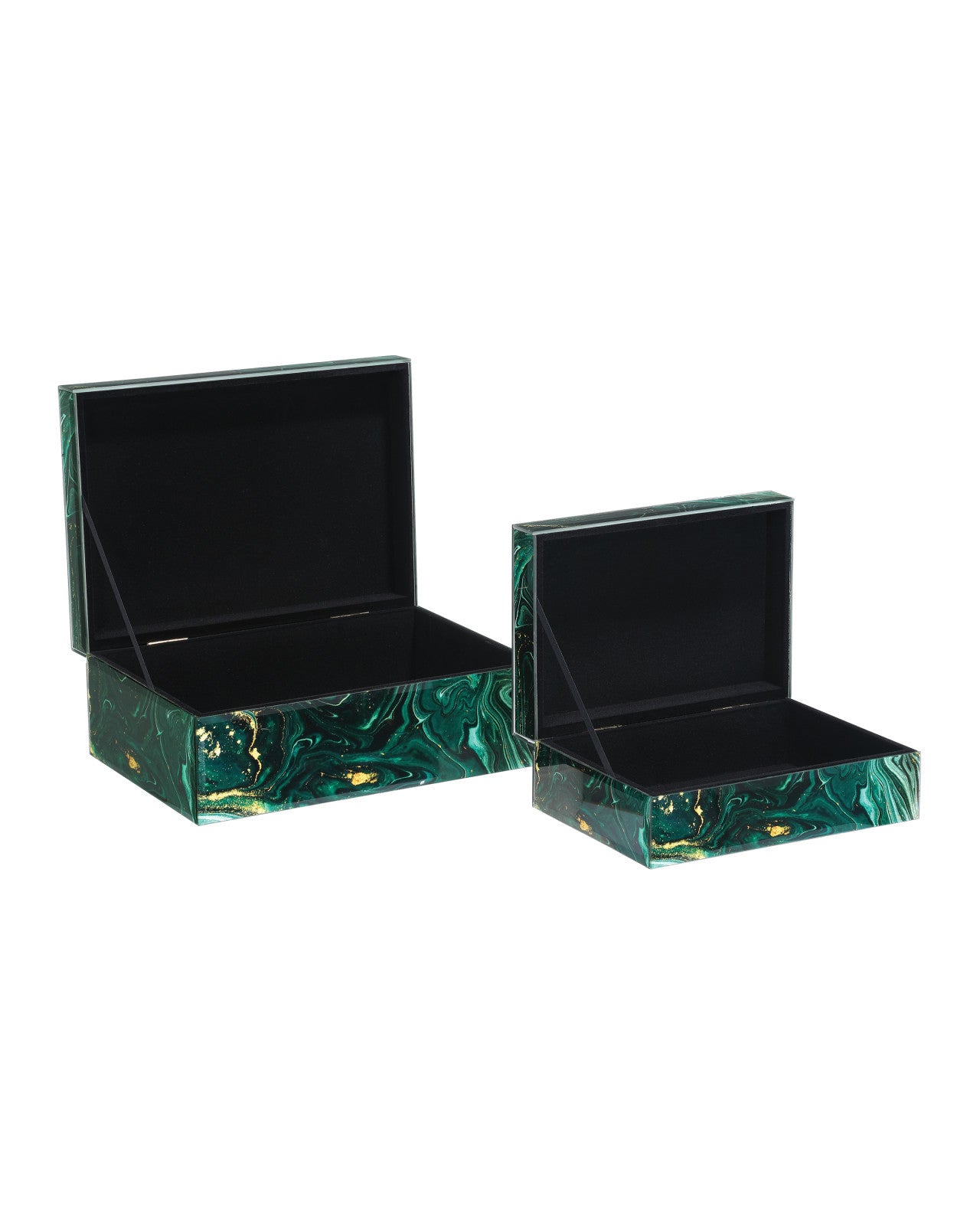 Description: Despite looking like they are made of stone, the Celestial Green Box Set's surfaces are the result of green swirl paper being encased in glass. The coating brings the exteriors of the decorative boxes an unparalleled sheen. The interiors are covered in black felt, and the small one will nest into the large one. Because these accessories are handmade, the patterns will vary.