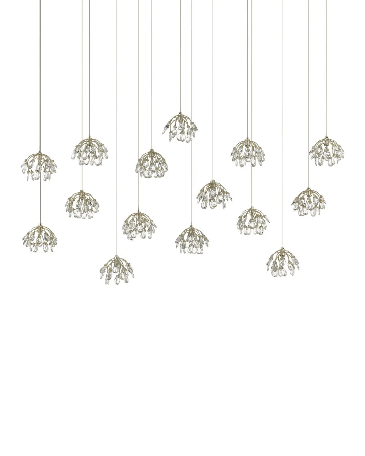 Description: The Crystal Bud Rectangular 15-Light Multi-Drop Pendant dangles flowers made of delicate faceted crystals from its canopy to make the shades effervescent and graceful. The canopy of this piece is luminous in a painted silver finish. This fixture is among multi-drop pendant collection, which includes multiple configurations.