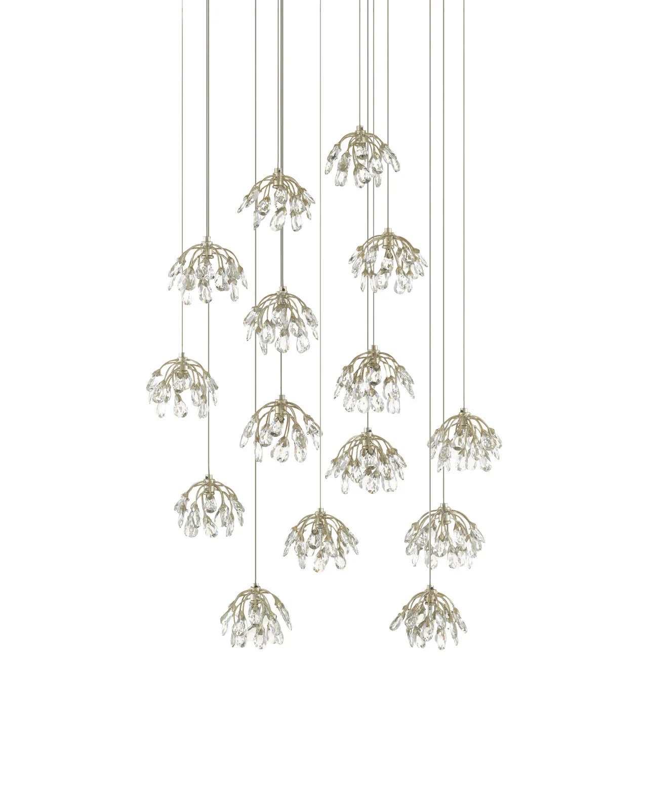 Description: The Crystal Bud Round 15-Light Multi-Drop Pendant dangles flowers made of delicate faceted crystals from its canopy to make the shades effervescent and graceful. The canopy of this piece is luminous in a painted silver finish. This fixture is among multi-drop pendant collection, which includes multiple configurations.