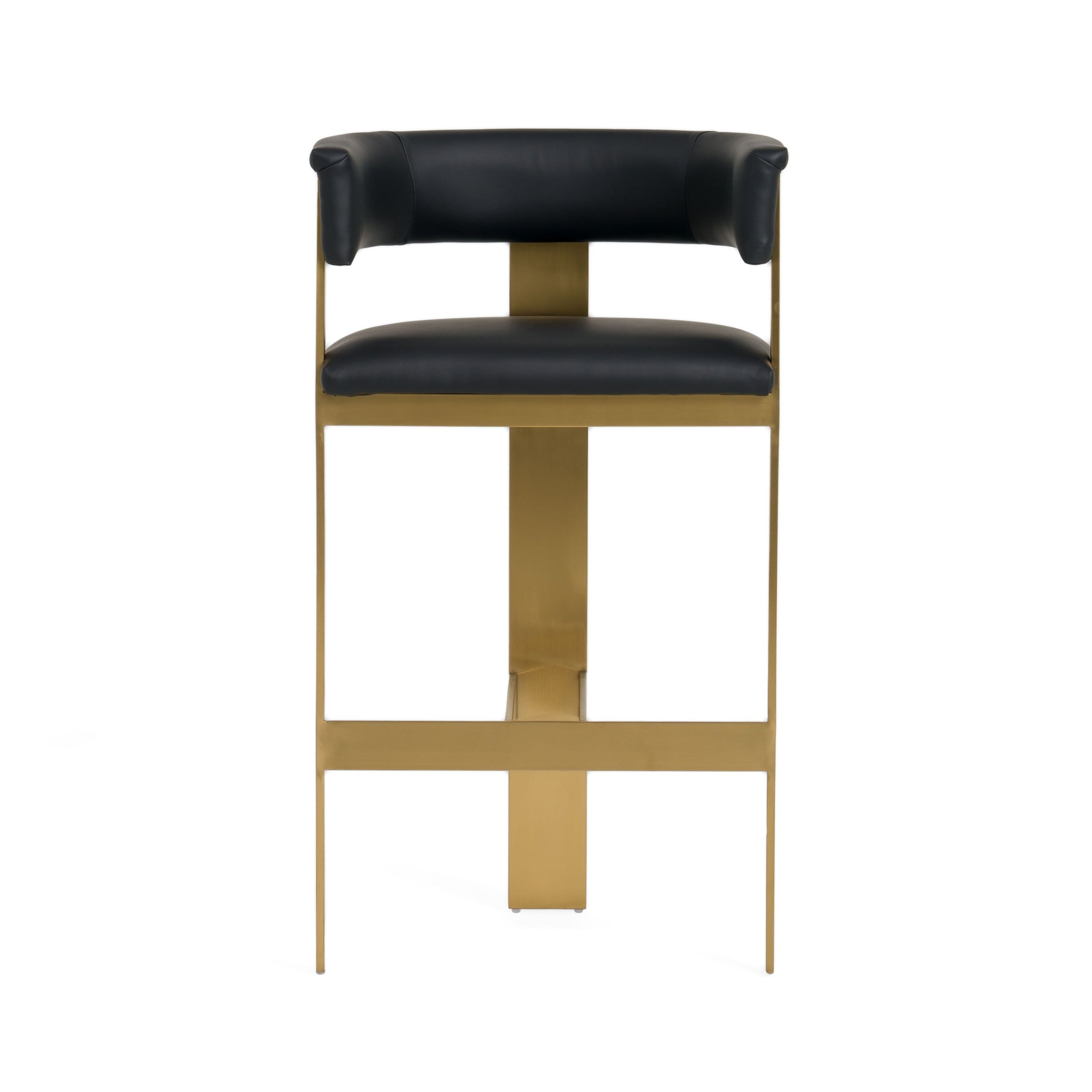 Description: Update your dining room with the Divine Barstool! This stunning piece features a rounded seat design with a polished gold metal frame and faux leather seat cushions. The silhouette evokes an Art Deco style while the materials hint at a modern piece. The faux leather is available in both white and black.