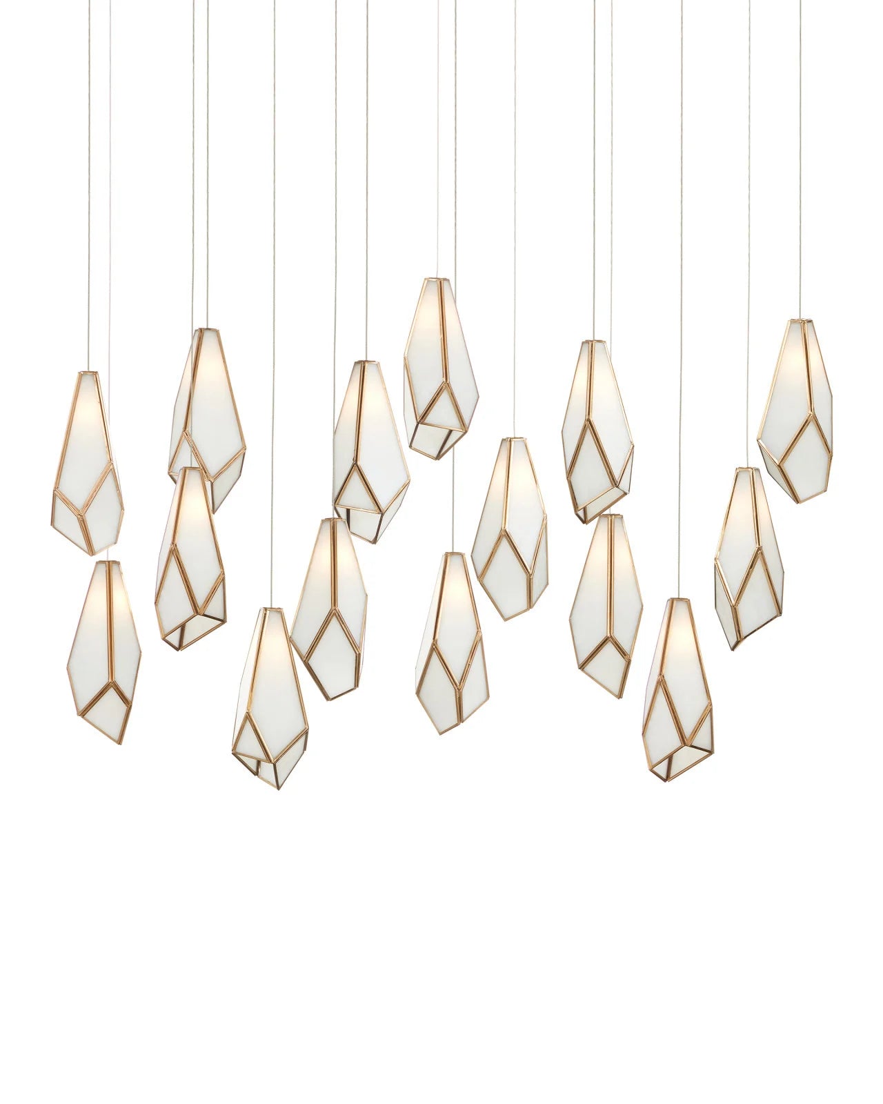 Description: The faceted shades of the Glace White Rectangular 15-Light Multi-Drop Pendant are made of panes of white art glass joined with seams of metal in an antique brass finish. The organic shape of the shades and the fact they hang at differing heights enhance the personality of this white pendant, which will ornament a space like a piece of jewelry. Art glass is one of the most artisanal materials that can be used, as its swirling opaque surface creates a milky glow whether lights are switched on or not. The canopy of this piece is luminous in a painted silver finish. This fixture is among multi-drop pendant collection, which includes multiple configurations.