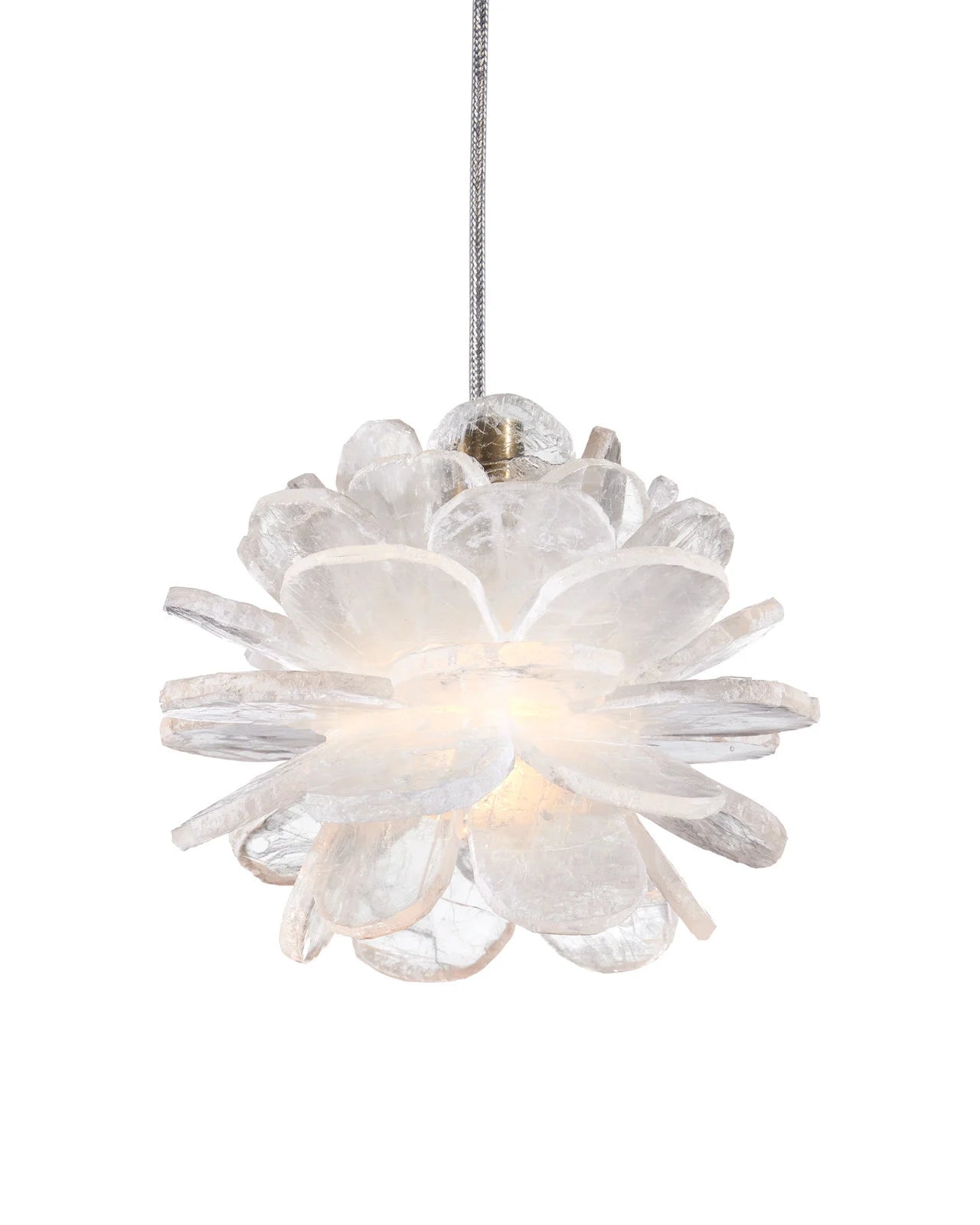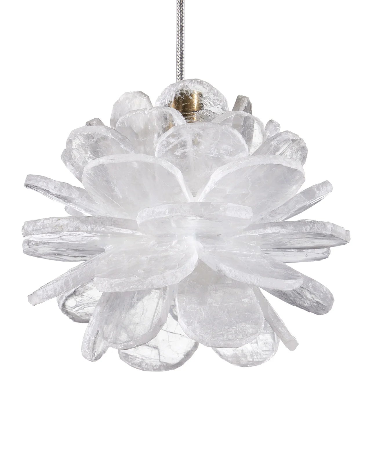 Description: The petite Solene Pendant looks like a flower with each of its petals made of natural Selenite. The crystal is very reflective so it creates a nice glow when illumination strikes it. The white pendant takes on another aspect of this natural material, as the textural quality of the crystal creates a more dynamic profile. It hangs from a slender cord to keep the design simple.
