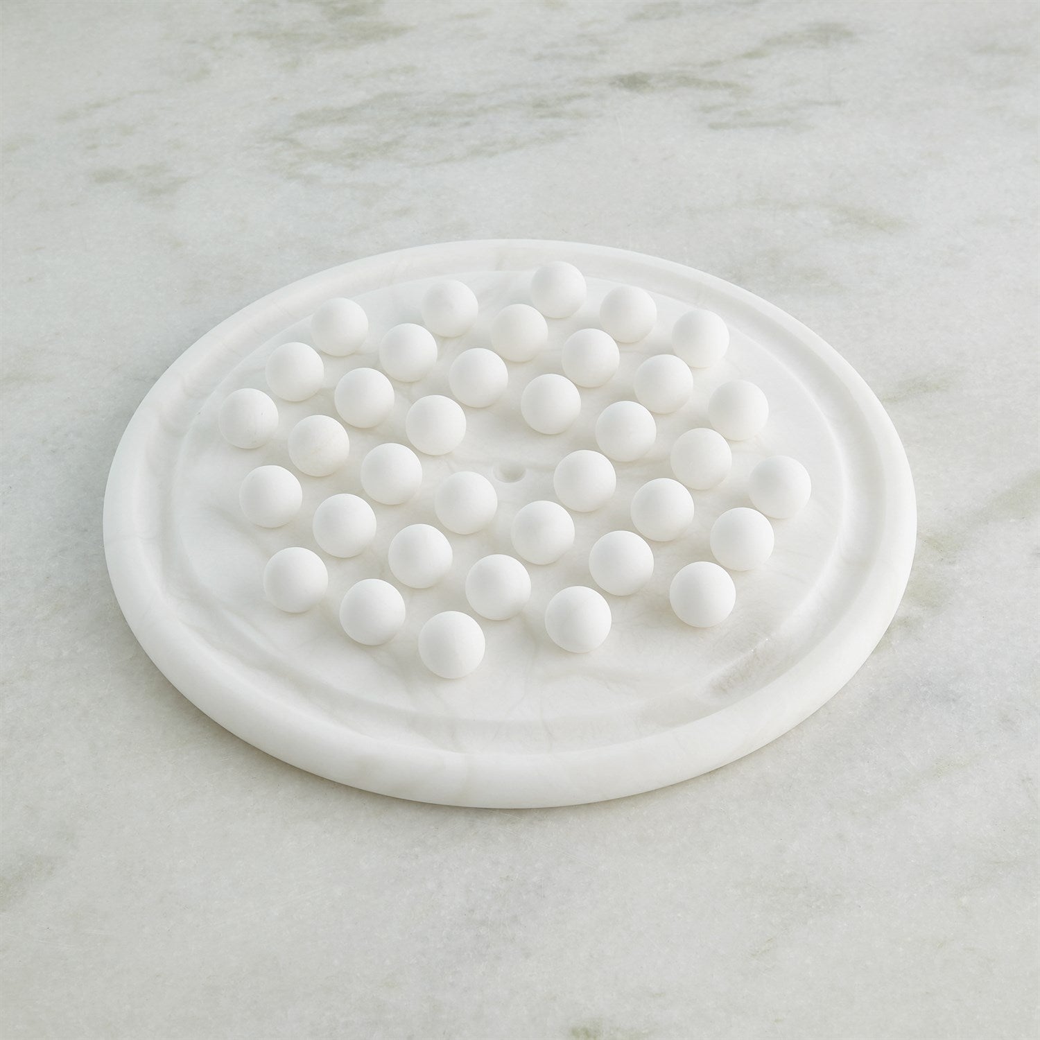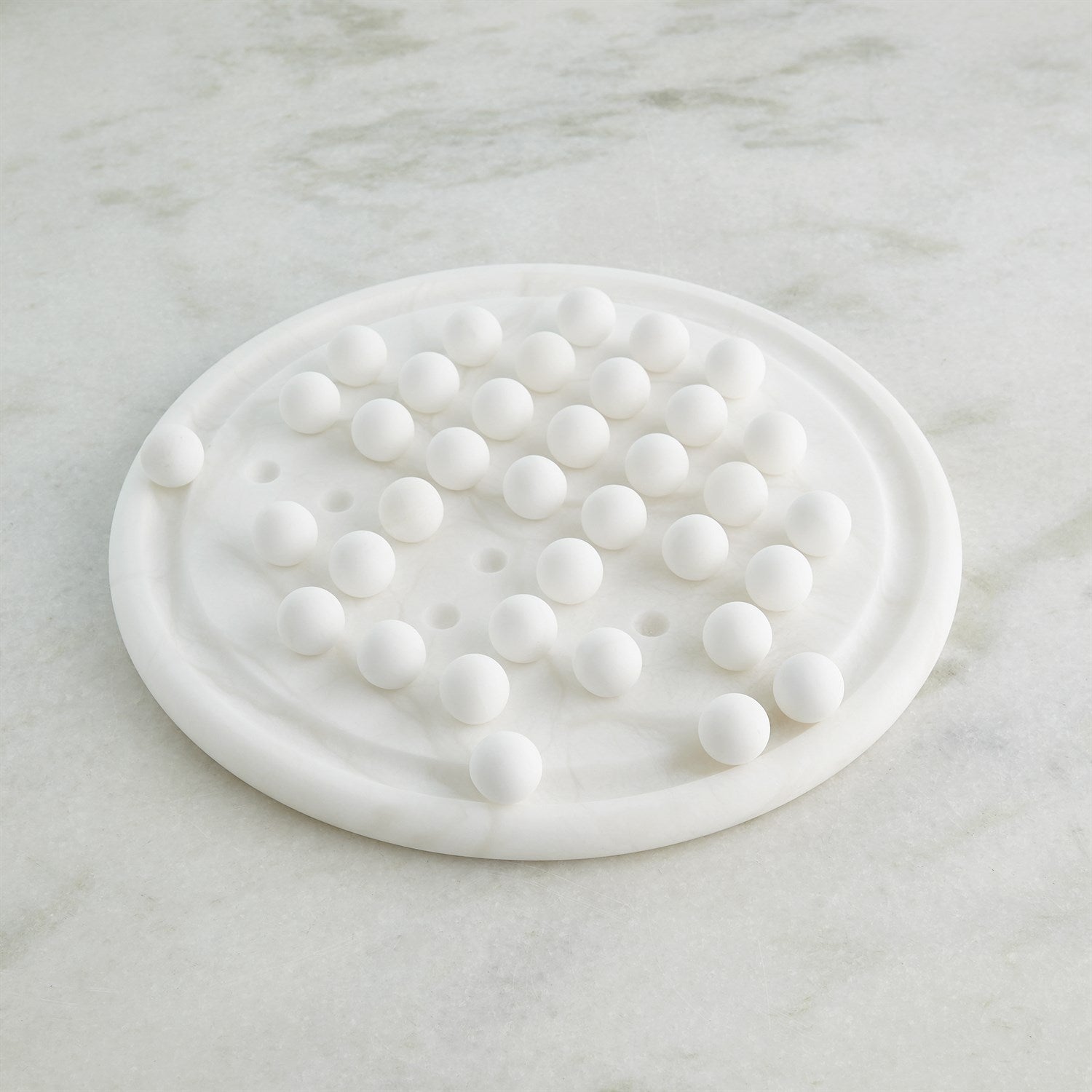Description: The Privy Alabaster Solitaire Game Set is our version of marble "English Solitaire". Crafted from carved alabaster, the game is played solo by jumping alabaster marbles in any direction, except diagonally, until you are left with just one alabaster marble. To start, leave the center hole empty and being jumping. Challenging yet beautiful, the Alabaster Solitaire Game Set adds fun and interest to any space.