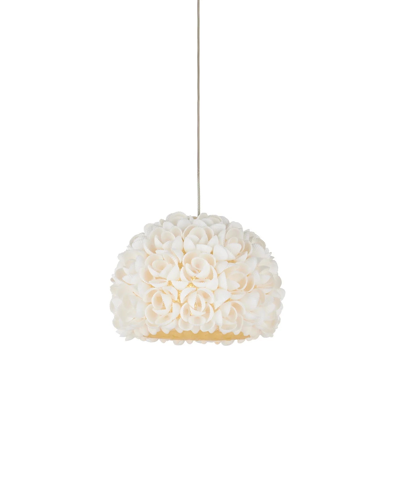 Description: The Virtu 1-Light Round Multi-Drop Pendant has a beautifully composed shade around which clamrose shells are fashioned to look like rosebuds; each petal hand-placed to make this an artisanal offering. The way the illumination wafts through the shade and surrounds the shells is a design detail of note with this lovely nature-inspired luminary.