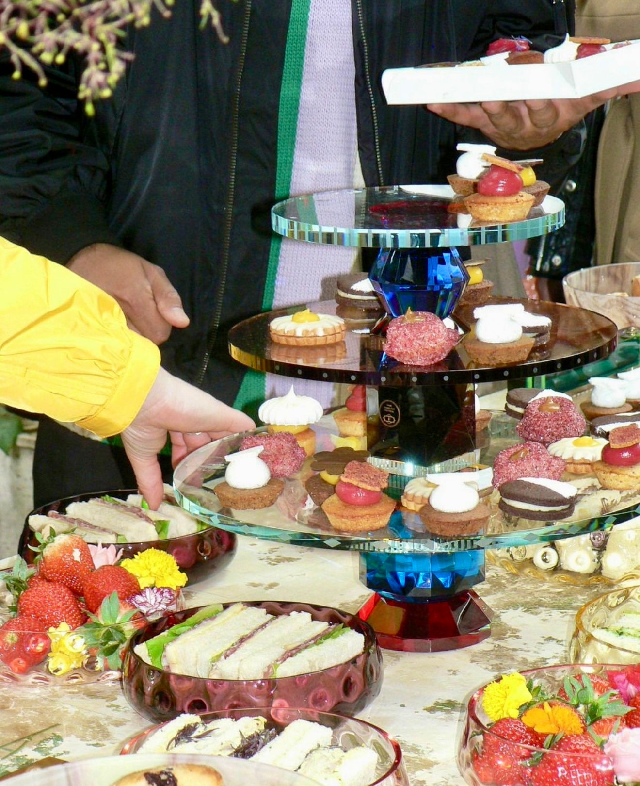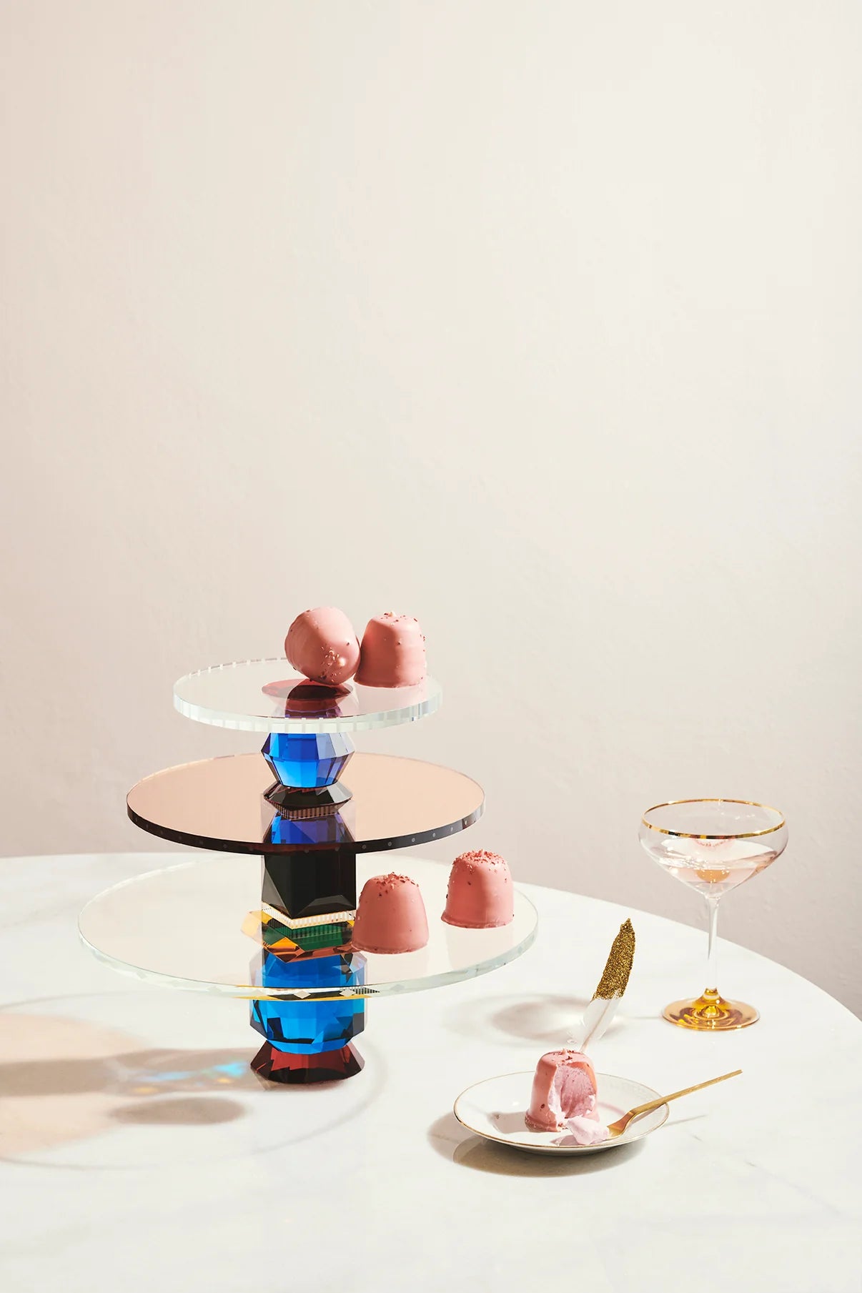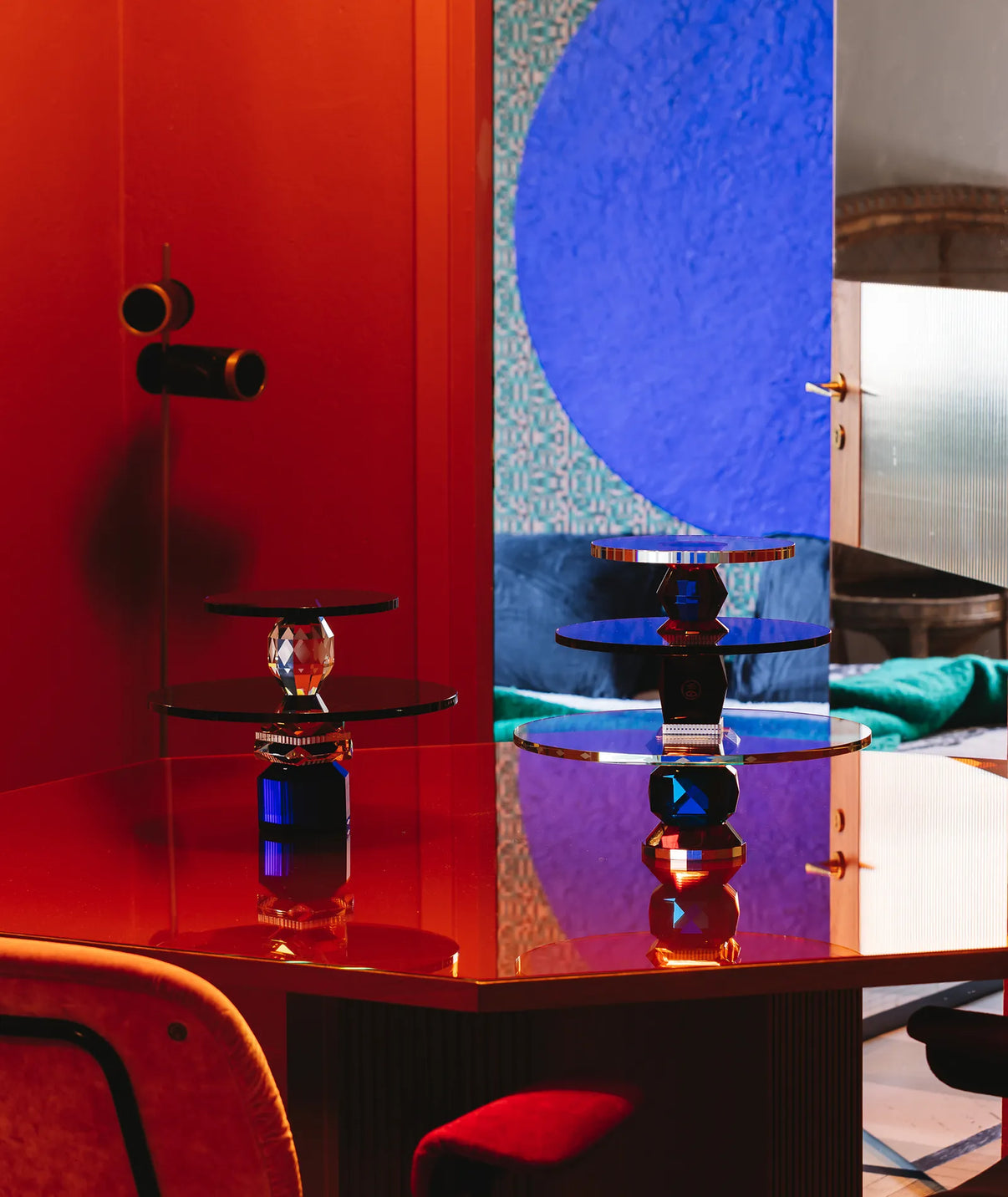 Description: The Amira Tray transforms presentation into a spectacle. Composed of three hand-cut crystal tiers in hues of blue, red, azure, black, and clear, each plate is subtly adorned with mirrored engravings and intricate inlays.