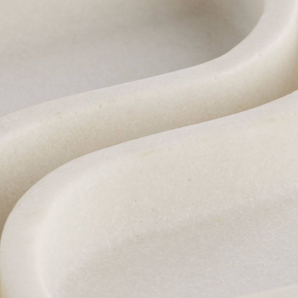 Description: A glamorous accent for a vanity or coffee table, theirs split tray of ivory riverstone composite is the ideal pairing of functionality and scale. Puzzled together, each tray is finished with details of antique brass iron and stands on matching brass feet finished with white felt on the underside. Finish will vary.
