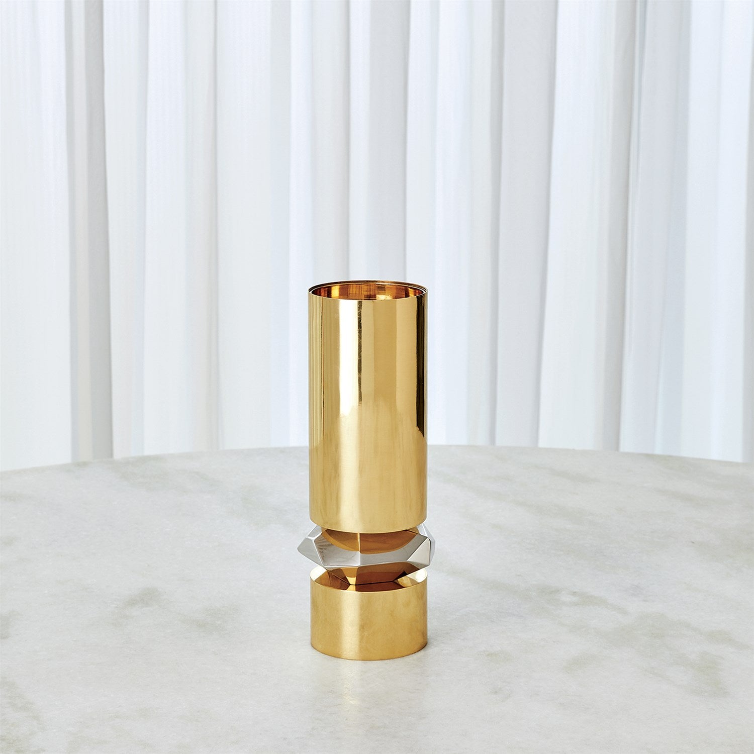 Description: The Romano Brass Candle Holder is made of shiny brass and nickel-plated brass. Holds 3 inch pillar candle.