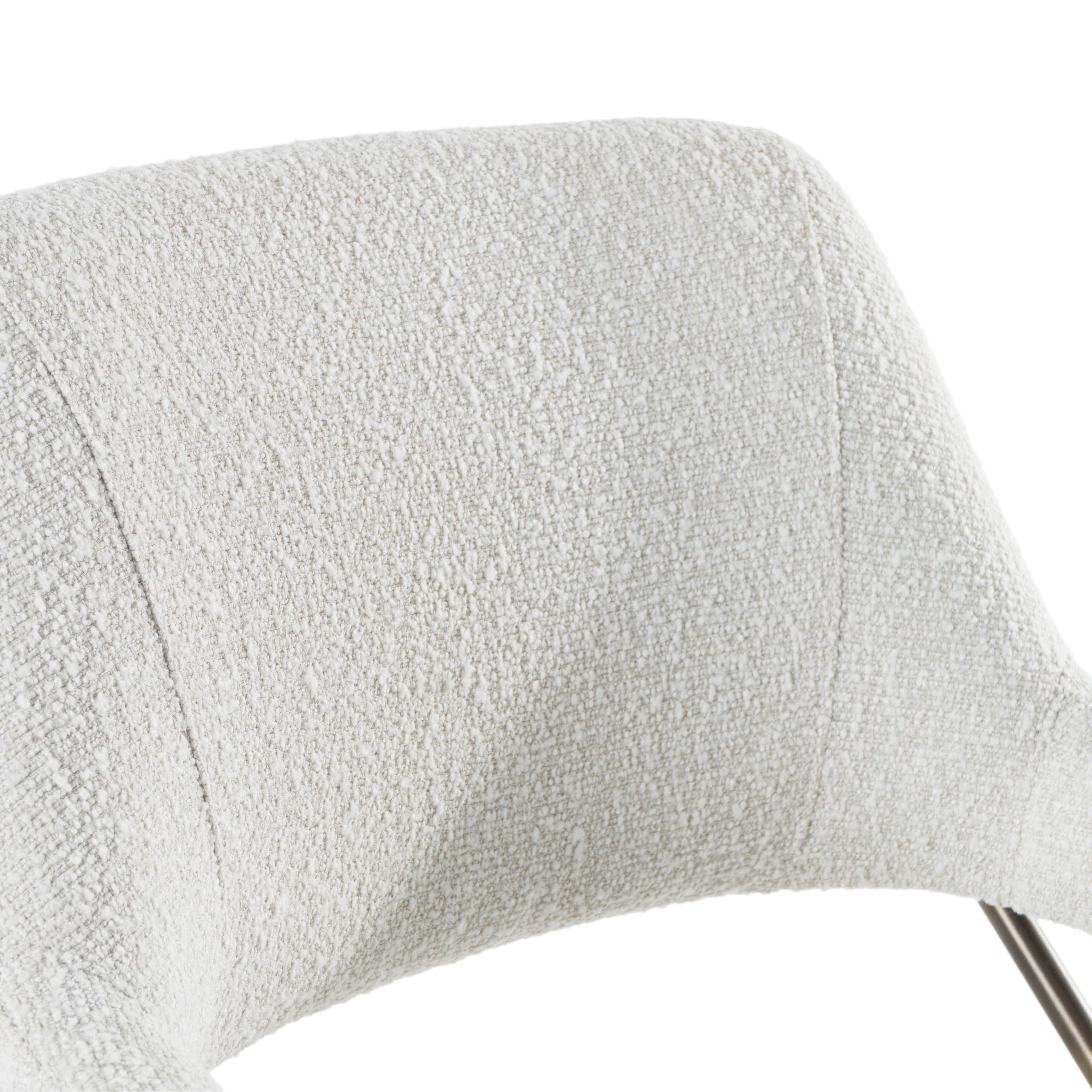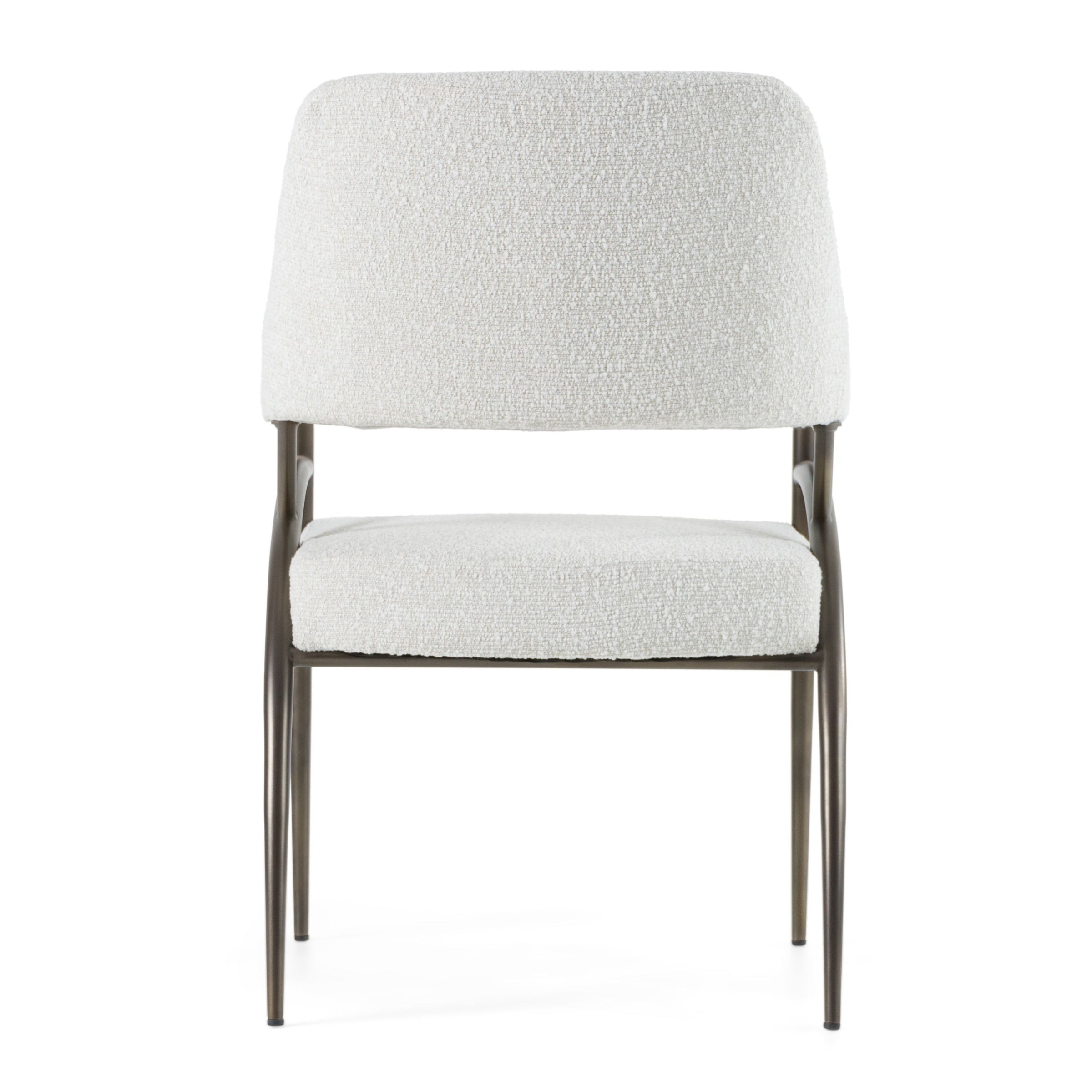Description: The Anna Modern Off-White Fabric + Bronze Dining Arm Chair presents a striking balance between modern sophistication and understated luxury. Upholstered in soft, off-white polyester fabric, this chair envelops you in comfort while its bronze iron frame exudes a timeless elegance. The fluid lines of its cross-back design and elegantly tapered legs offer a refined yet contemporary touch, making it an ideal accent for chic, upscale dining settings. Perfectly crafted for those who appreciate the fusion of artistry and comfort, this piece effortlessly enhances the ambiance of a modern home, inviting guests to dine in unparalleled style.