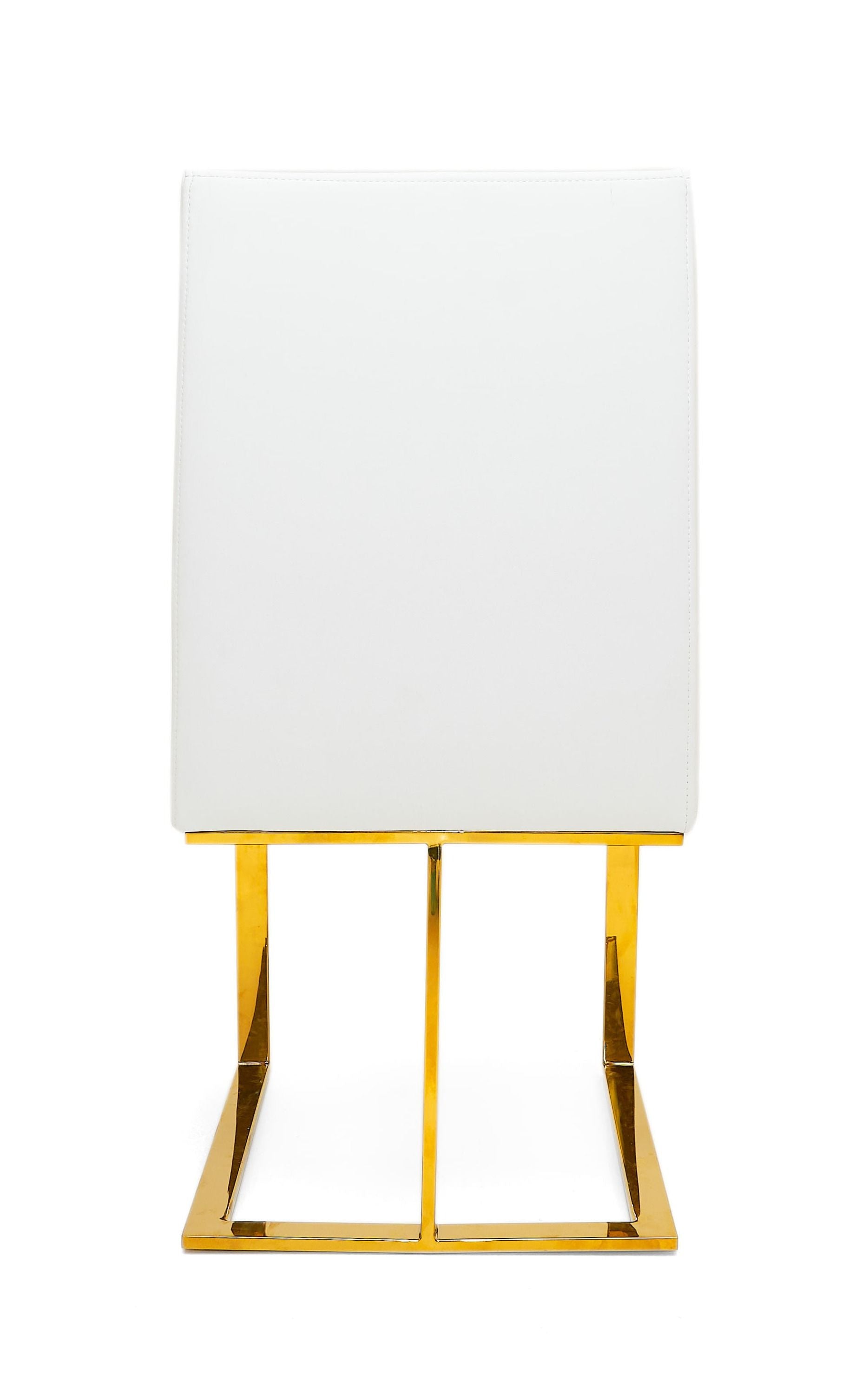 Description: The Camille is a contemporary modern dining chair that shines against and space. The beautiful white vegan leather upholstery is juxtaposed by the bright gold exposed metal that is sure to add luxury and class.