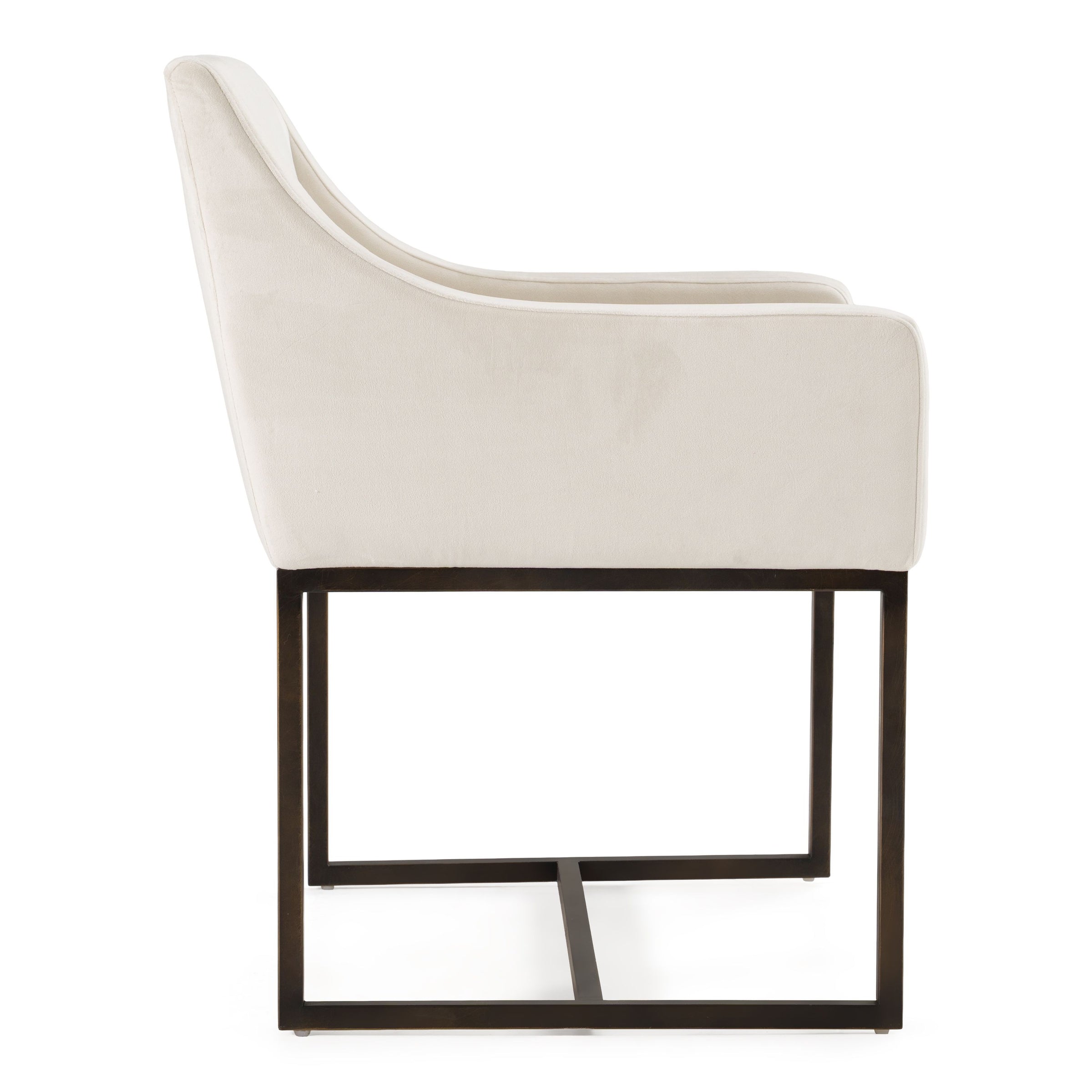 Description: The Isabeau Dining Chair is a beautiful modern contemporary piece of furniture. The squared slope arms match height perfectly with the low back of the chair, creating a fully embracing silhouette. Upholstered in an beige velvet fabric, this chair is comfortable and stylish. The antique brass finished legs have modern lines and contrast the soft fabric. These versatile chairs can be paired with any style and look right at home.