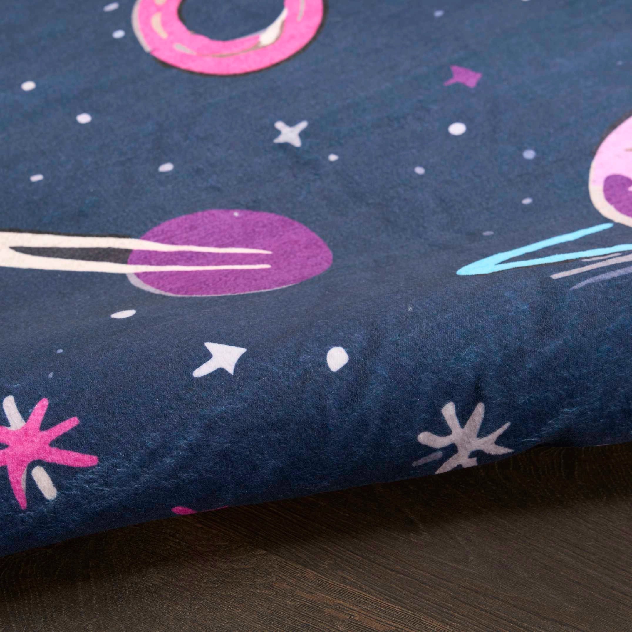 Description: Inspire a love for the cosmos with this space-themed kids rug from the Space collection. The dark background brings out the charm of the printed purple and blue planetary scene, making this rug perfect for aspiring astronauts. This rug is machine washable with a soft polyester construction and non-skid backing.