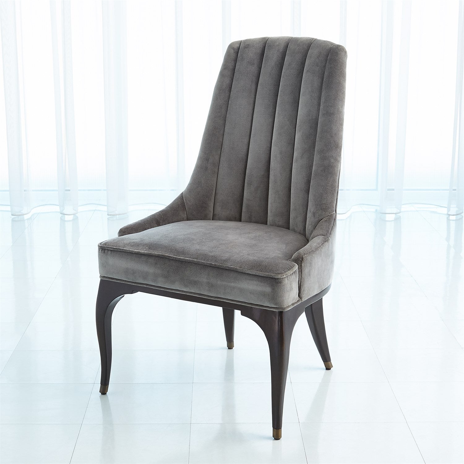 Description: Custom designed, our Channel Tufted Dining Chair is distinguished by deep channels of stitched velvet with a sheen to give a formal feel. Elegant shapely legs and frame are finished in a dark waxed oiled walnut finish. Another distinct characteristic of this chair is the arching back shape, as elegant and visually beautiful from the front or from a back view. Also available in muslin.