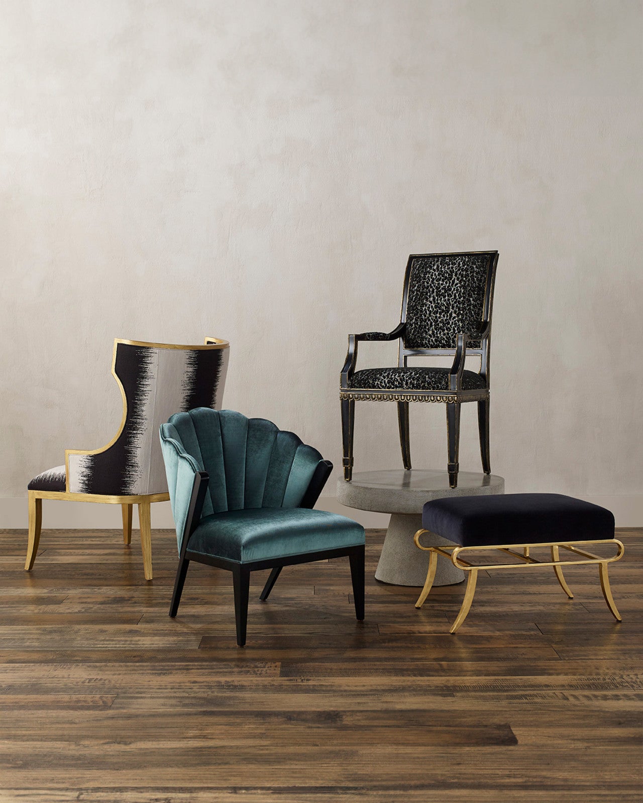 Description: Chic, comfortable, and timeless, the Garson Gold Armchair is an updated take on the classic wingback design. The frame is made of mahogany with an antique gold finish. The black and white chair is upholstered in an Otunga Kona fabric.