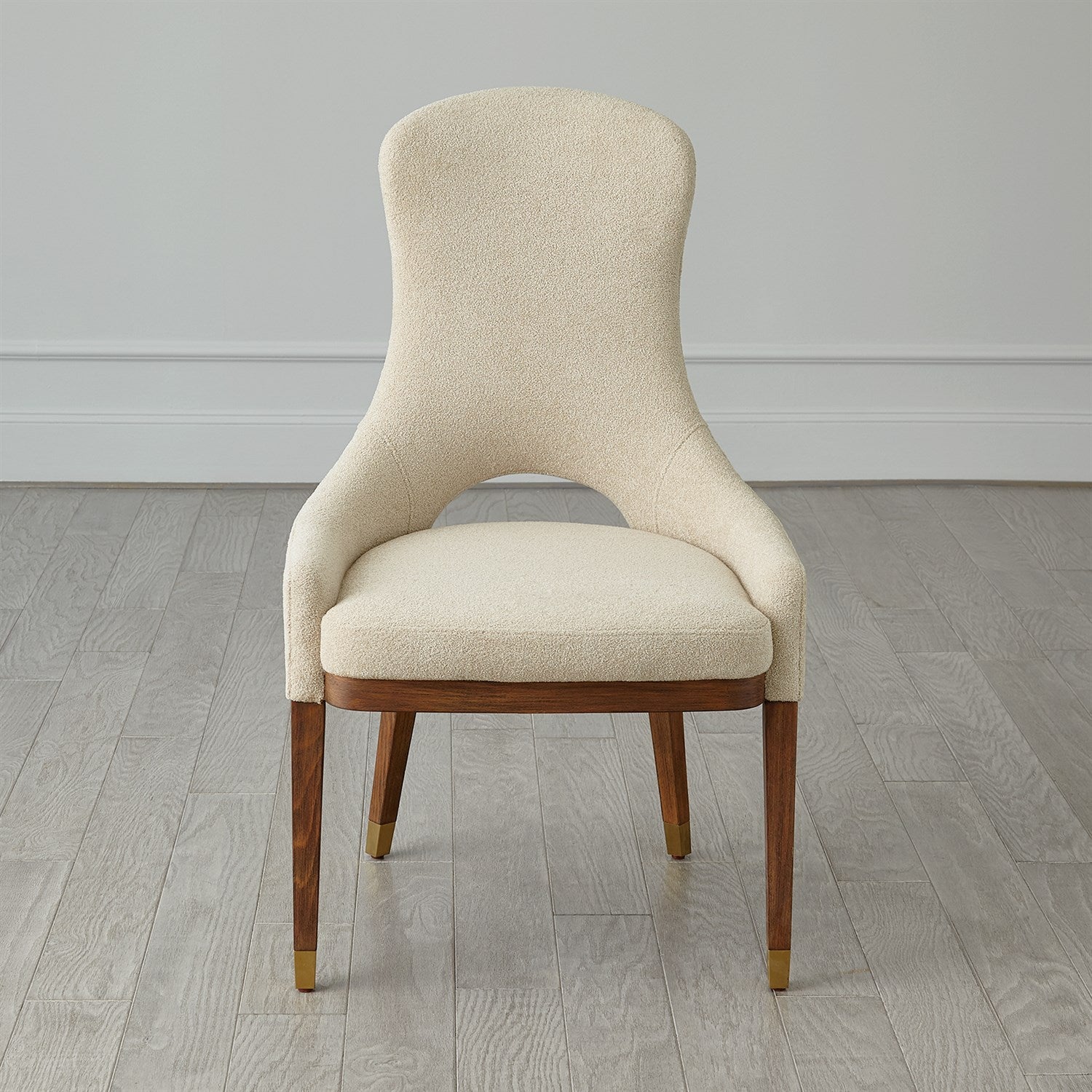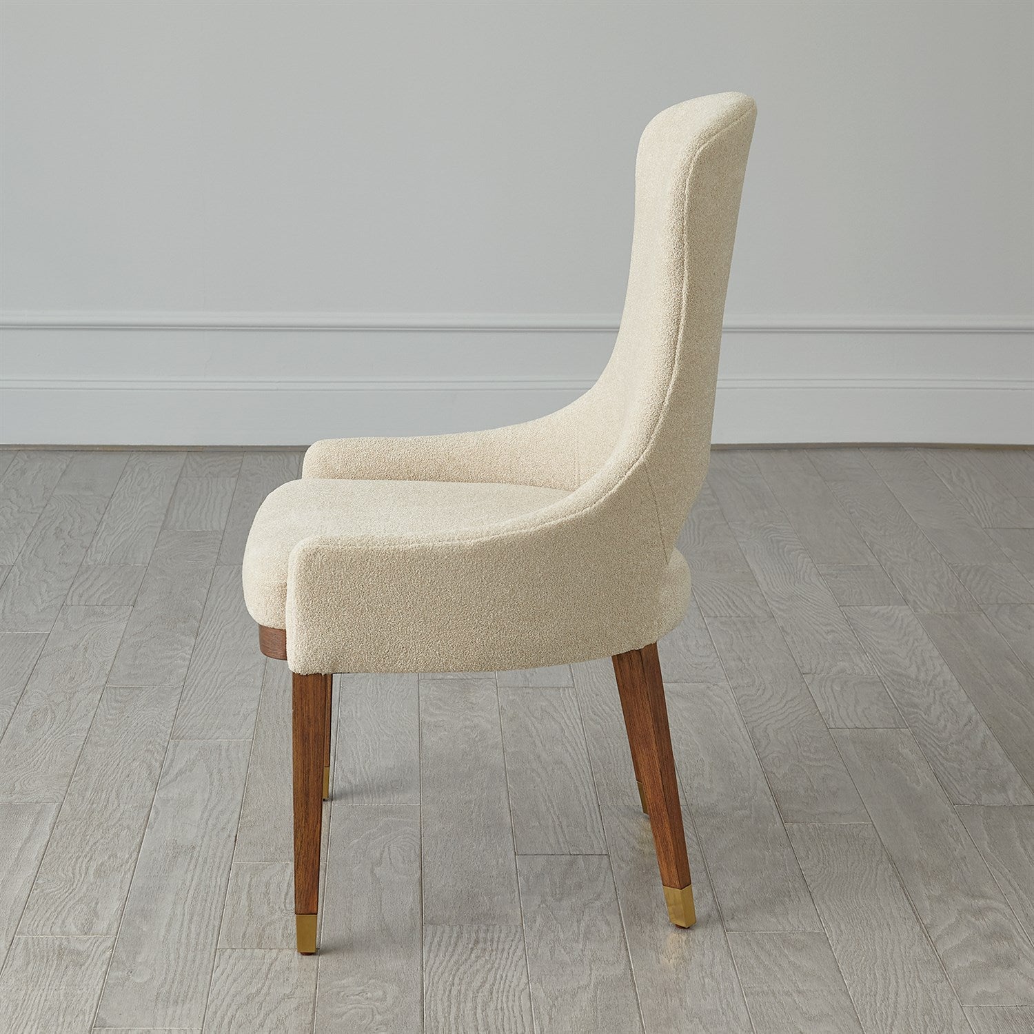 Description: The curves of the Lola Dining Chair sweep delicately upward wrapping the back in comfort. The chairs feature a solid beech wood frame with a light oak finish and brushed brass feet. The bouclé fabric is stain resistant for years of use and the slightly domed seat supports in all the right areas.
