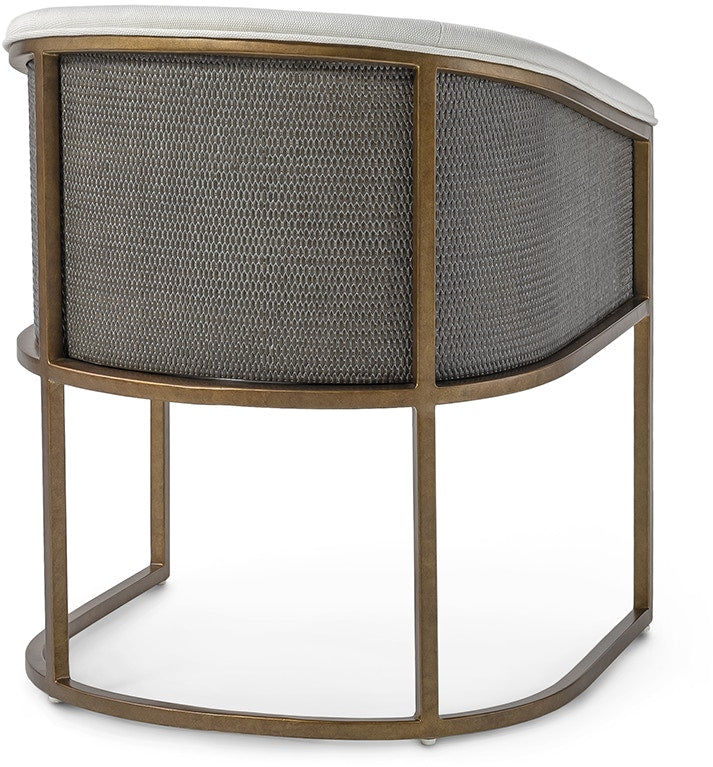 Details: Antique gold finish metal frame and legs with a fixed upholstered seat and fully upholstered inside backrest. The outside backrest features cane matting finishes. Coordinates with the Chelsea collection.