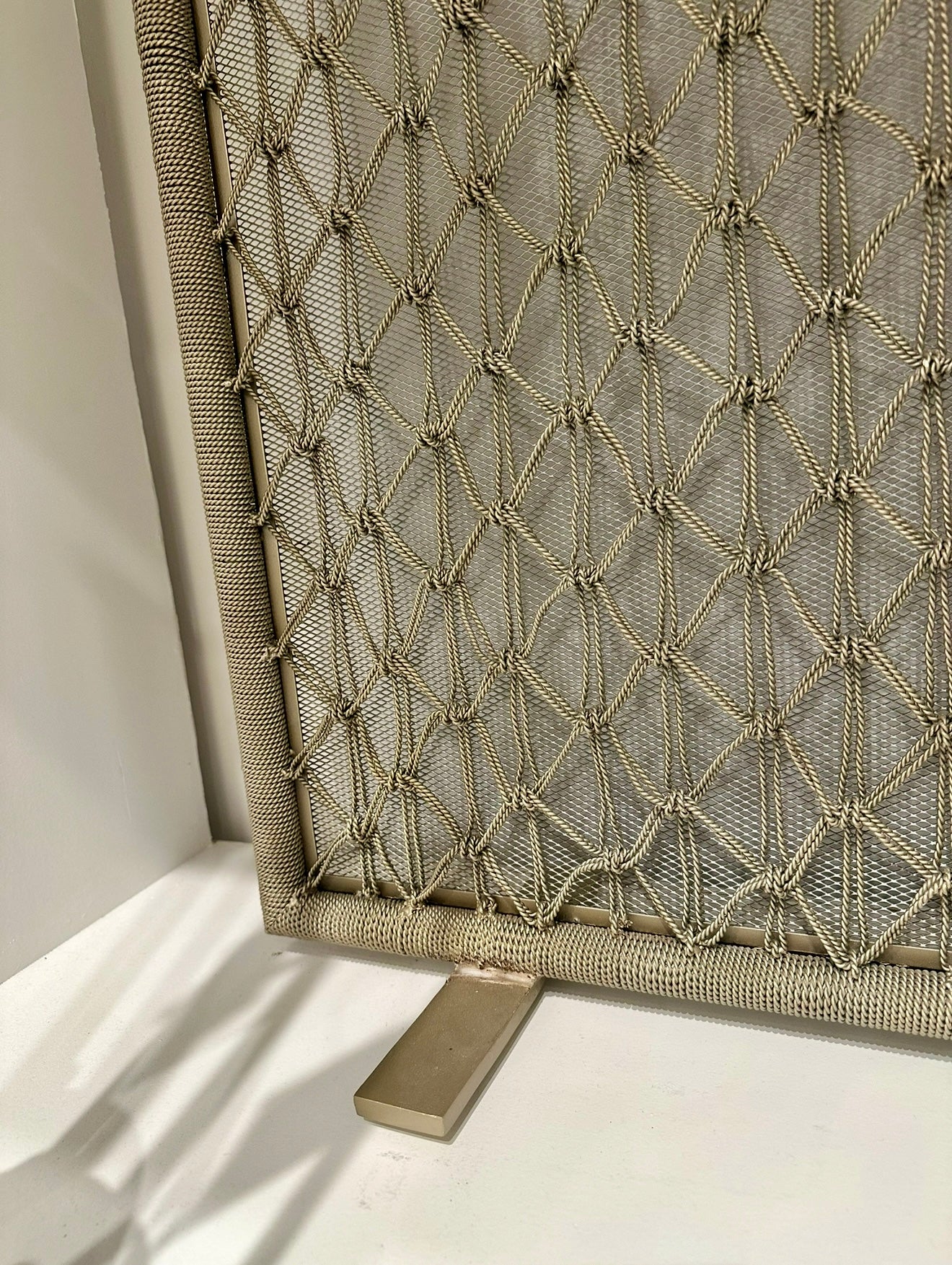 Description: Thin wrought iron metal strips hand-twisted and woven together to resemble a finely woven rope over a wrought iron frame accented with solid wrought iron metal feet all in a champagne finish. The flat panel screen features a heavy-duty mesh to protect against firewood sparks and debris and was designed to fit a standard-sized fireplace. Screen may become hot with use near an open fire, please always use caution. We recommend using dedicated fire gloves to move the screen. Coordinates with the Kensington fireplace collection.