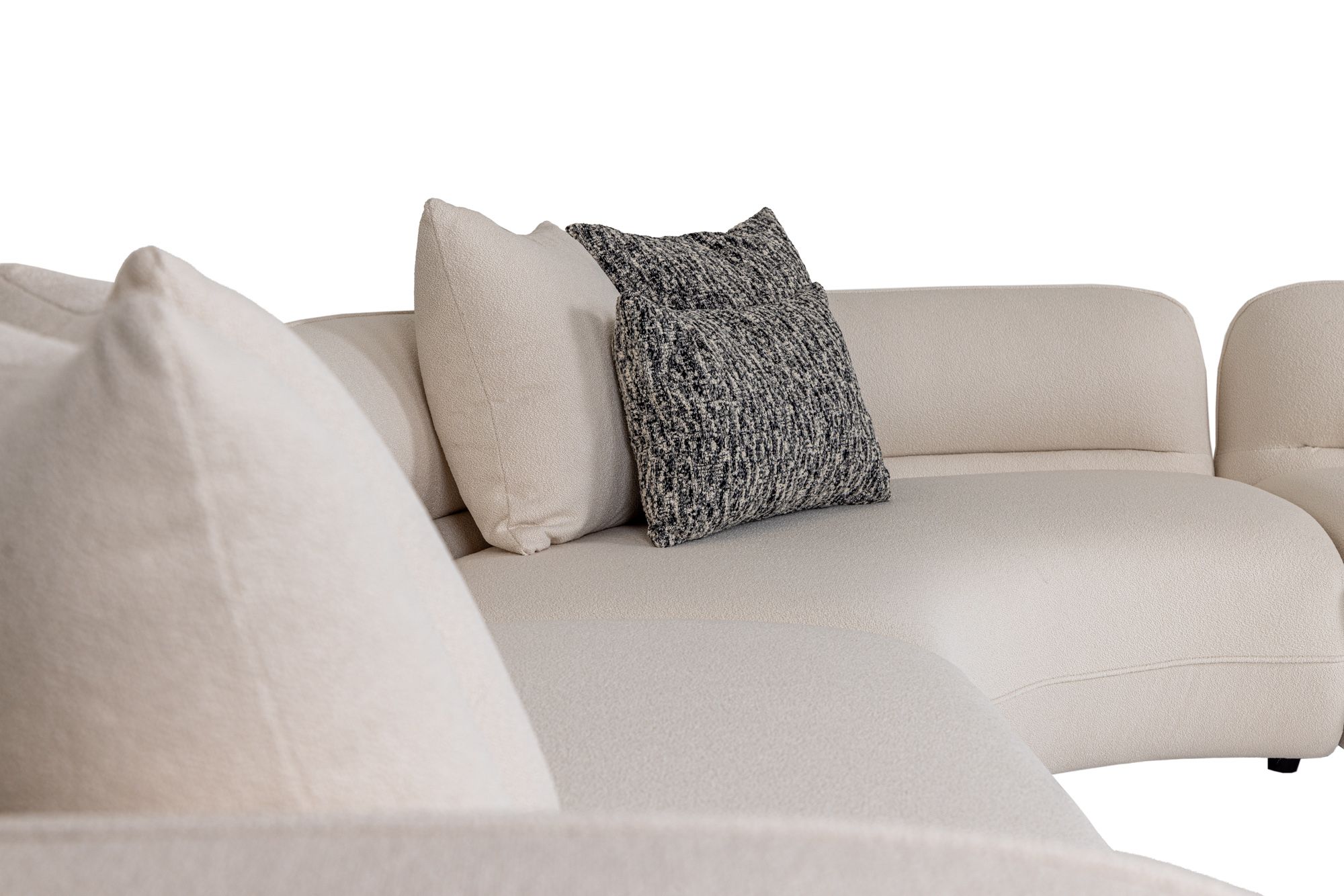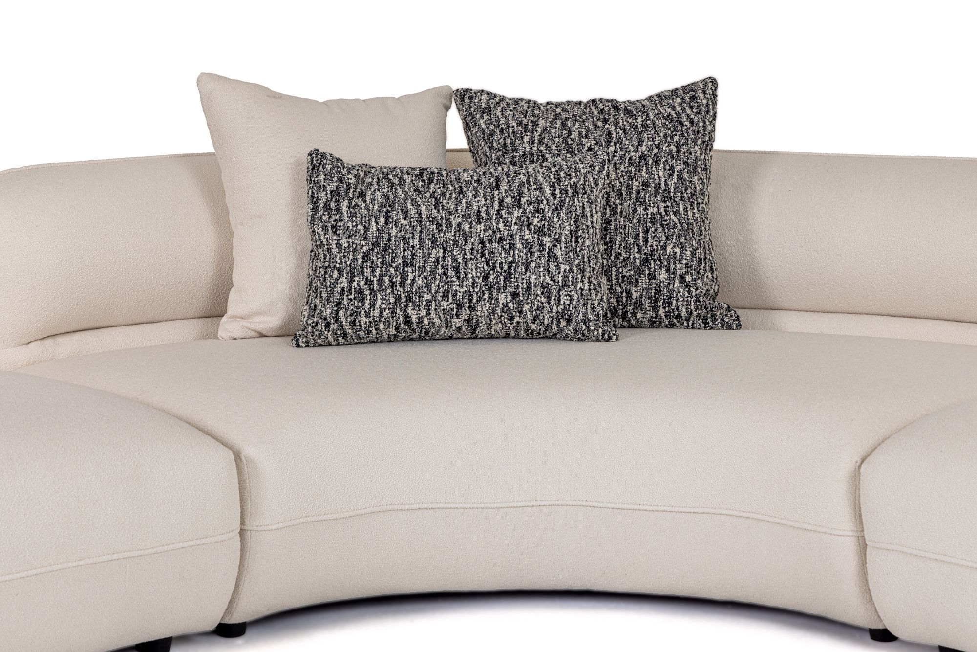 Description: The Stratford Modern Off-White Fabric Sectional Sofa is a stylish addition to your living space. Crafted with care, this L-shaped 3-piece sectional sofa features an upholstery in 100% polyester for comfort and durability. The off-white color of the body and five pillows exudes elegance, while the grey accent pillows add a touch of sophistication. With foam-filled seats and back, this sofa ensures cozy lounging. Its solid ash and manufactured wood frame, round arms, and tight back design make it both functional and chic. Perfect for modern homes seeking comfort and style!