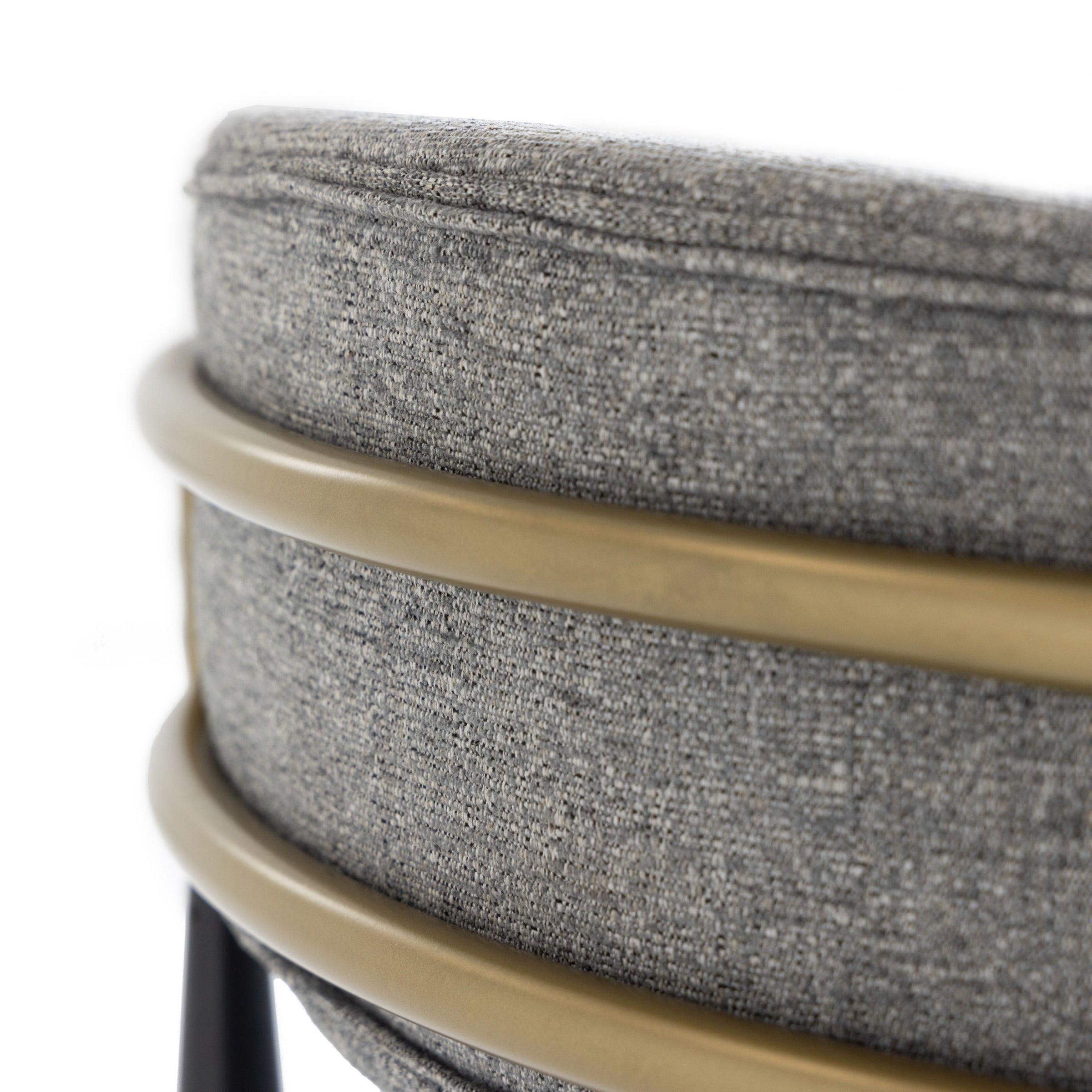 The Nicole dining chair features a stylish Mid-Century Modern design, characterized by its medium grey upholstery and sleek gold armrests. The elegant black legs are tapered, adding a sophisticated touch to any dining space. This chair seamlessly combines comfort and contemporary aesthetics, making it a perfect addition to modern interiors. Ideal for both casual and formal dining settings, it enhances the overall decor with its chic silhouette and refined color palette.