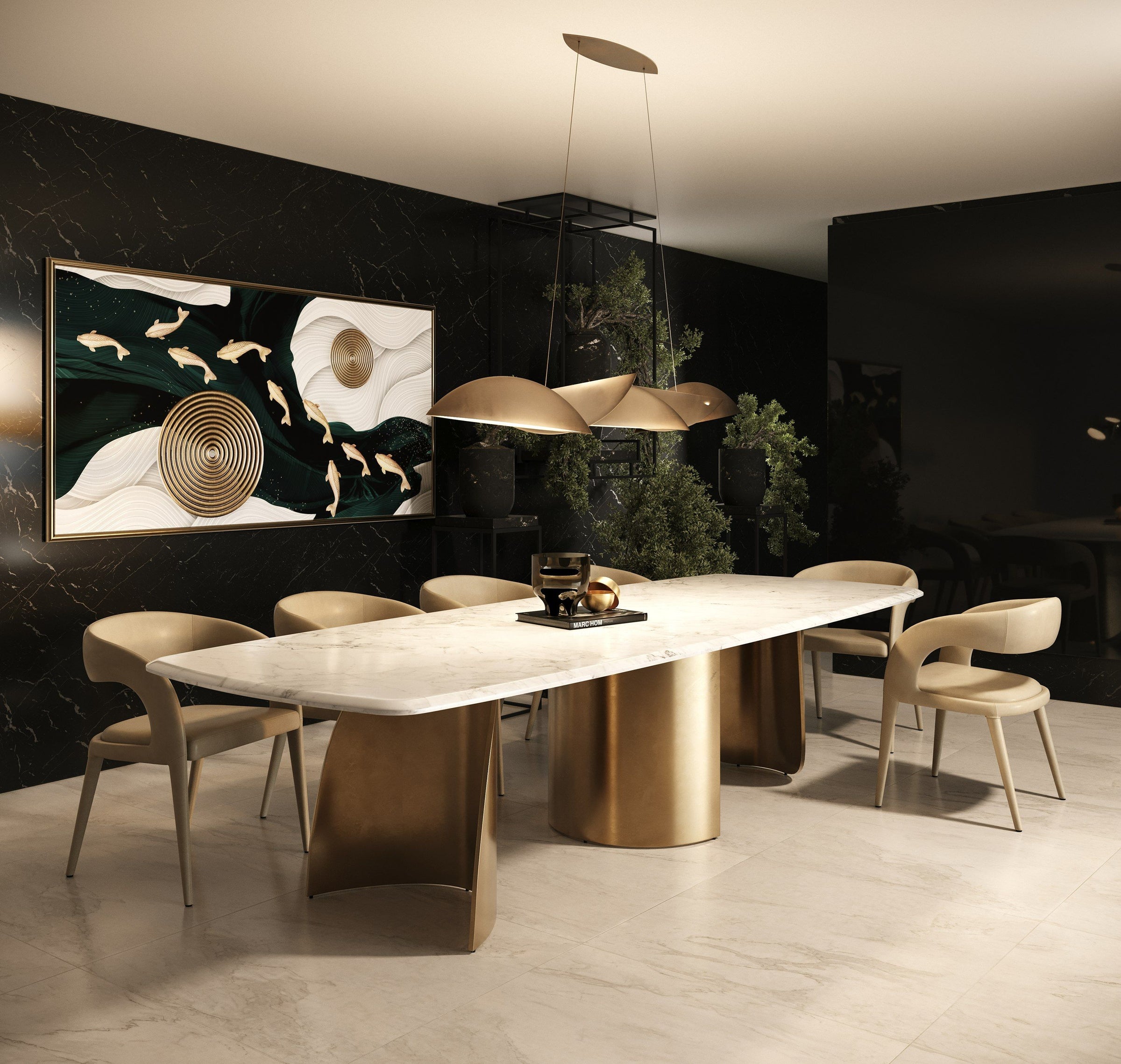 The Taylore Glam Dining Table is a stunning embodiment of modern luxury. With its sleek faux marble top and bold gold stainless steel base, it strikes the perfect balance between elegance and contemporary sophistication. The sculptural base not only supports the expansive surface but also adds an artistic flair, making this table a true center piece for any dining space. Designed for those who appreciate opulence and refinement, the Taylore table invites a glamorous ambiance into your home, transforming every meal into an unforgettable experience.