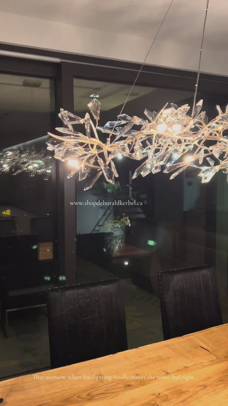 An elegant branch of Antique Silver elegantly stretches itself into a floating wreath with the Bello Fourteen-Light Chandelier. Lining the horizontal branch, a staggered arrangement of breathtaking hand-cut crystal leaves playfully refracts light, imbuing the piece with an undeniable presence. This piece is an interpretation of nature’s beauty through the language of modern design.