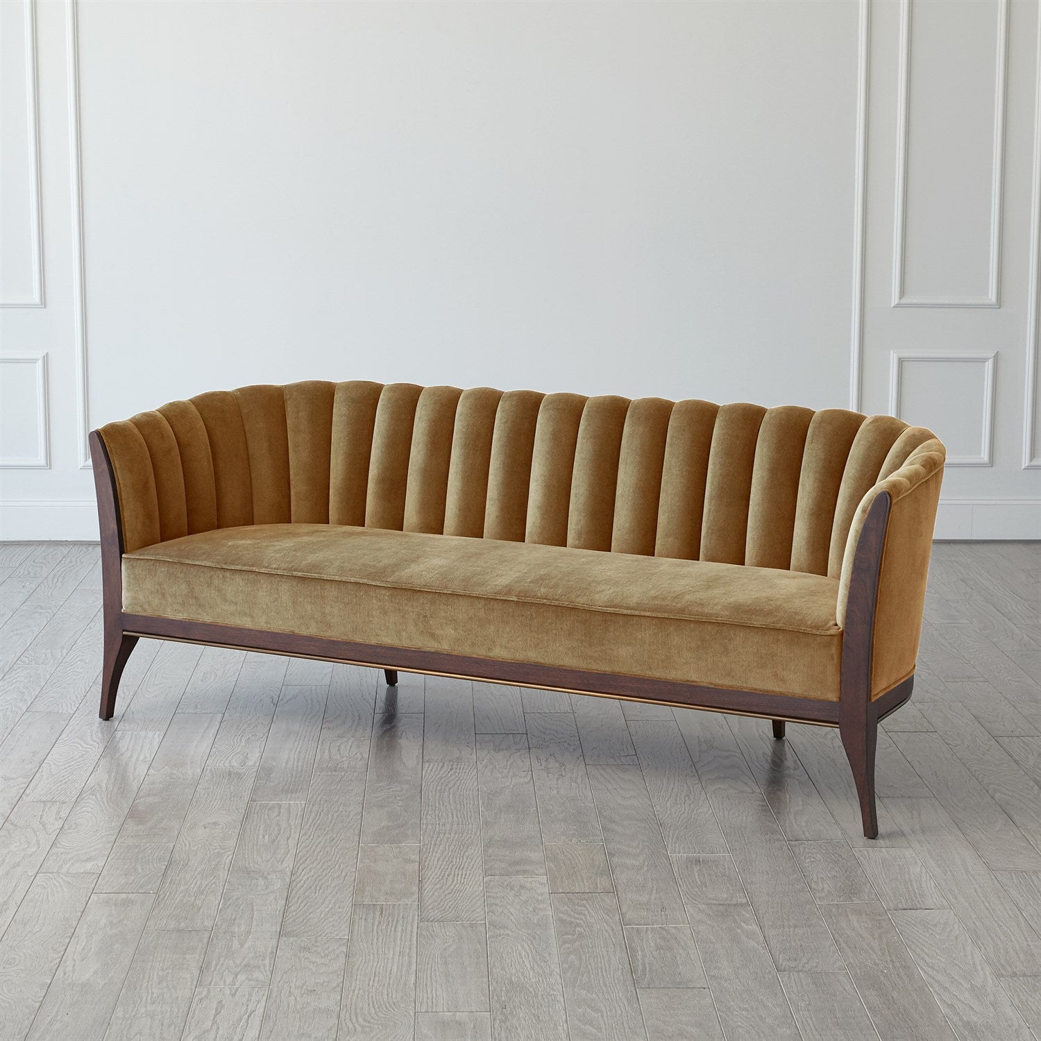 Description: Custom designed, our Channel Back sofa is distinguished by deep channels of stitched, 100% cotton, toast velvet around the back support. A beautiful wooden base supports the sofa and is accentuated along the bottom edge with a filet of solid brass running around the entire frame of the sofa. Elegant shapely legs and frame are finished in a dark waxed oiled walnut finish. Another distinct characteristic of this sofa is the arching back shape, as elegant and visually beautiful from the front or from a back view.