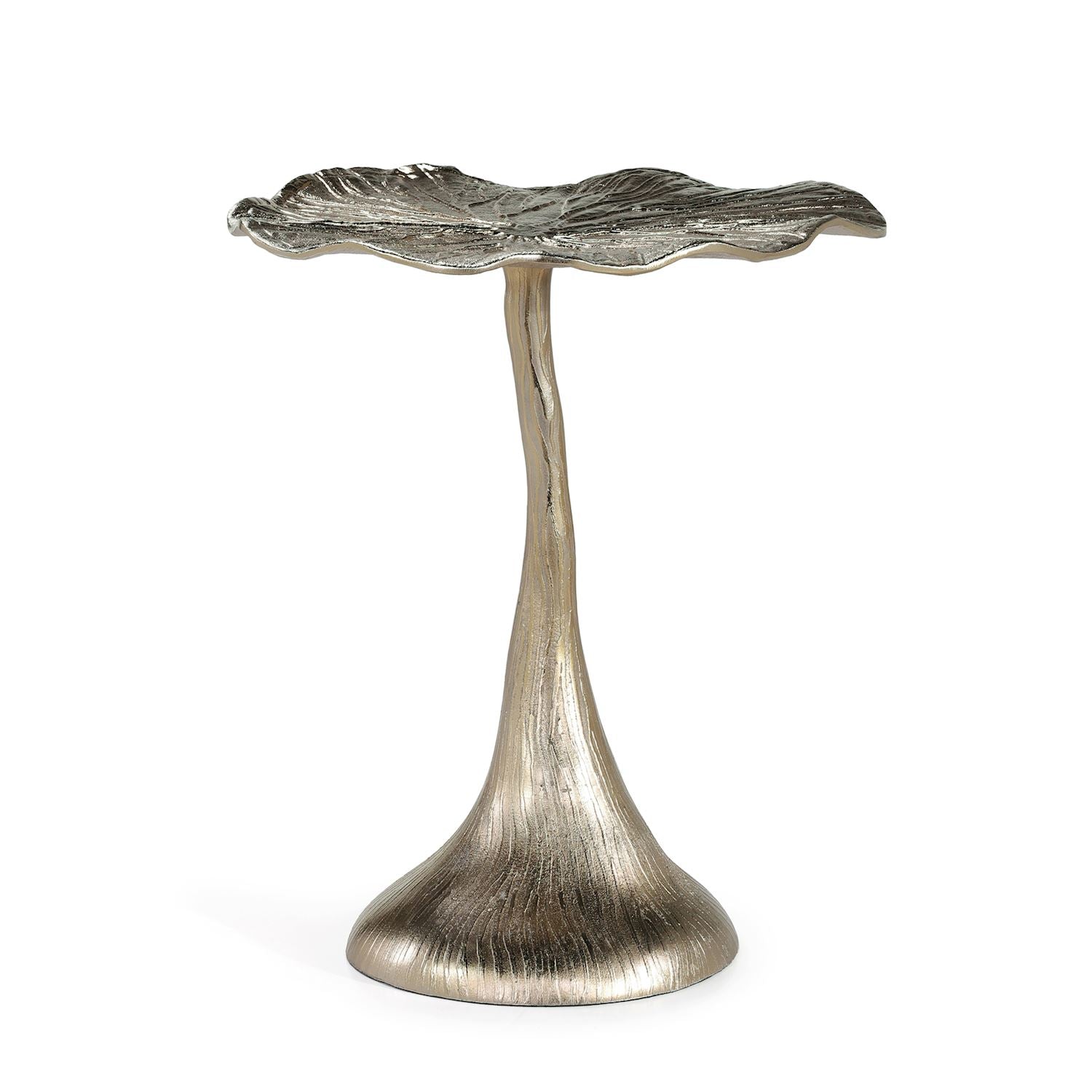Description: The Leona Lily Pad Accent Table showcases natural inspiration through its unique tabletop that depicts an aluminum lily pad in Brass & Nickel, displaying organic curves and detailed textures. The asymmetrical base tapers inwards to resemble the stem of a plant, bringing touches of the great outdoors to your interior space.
