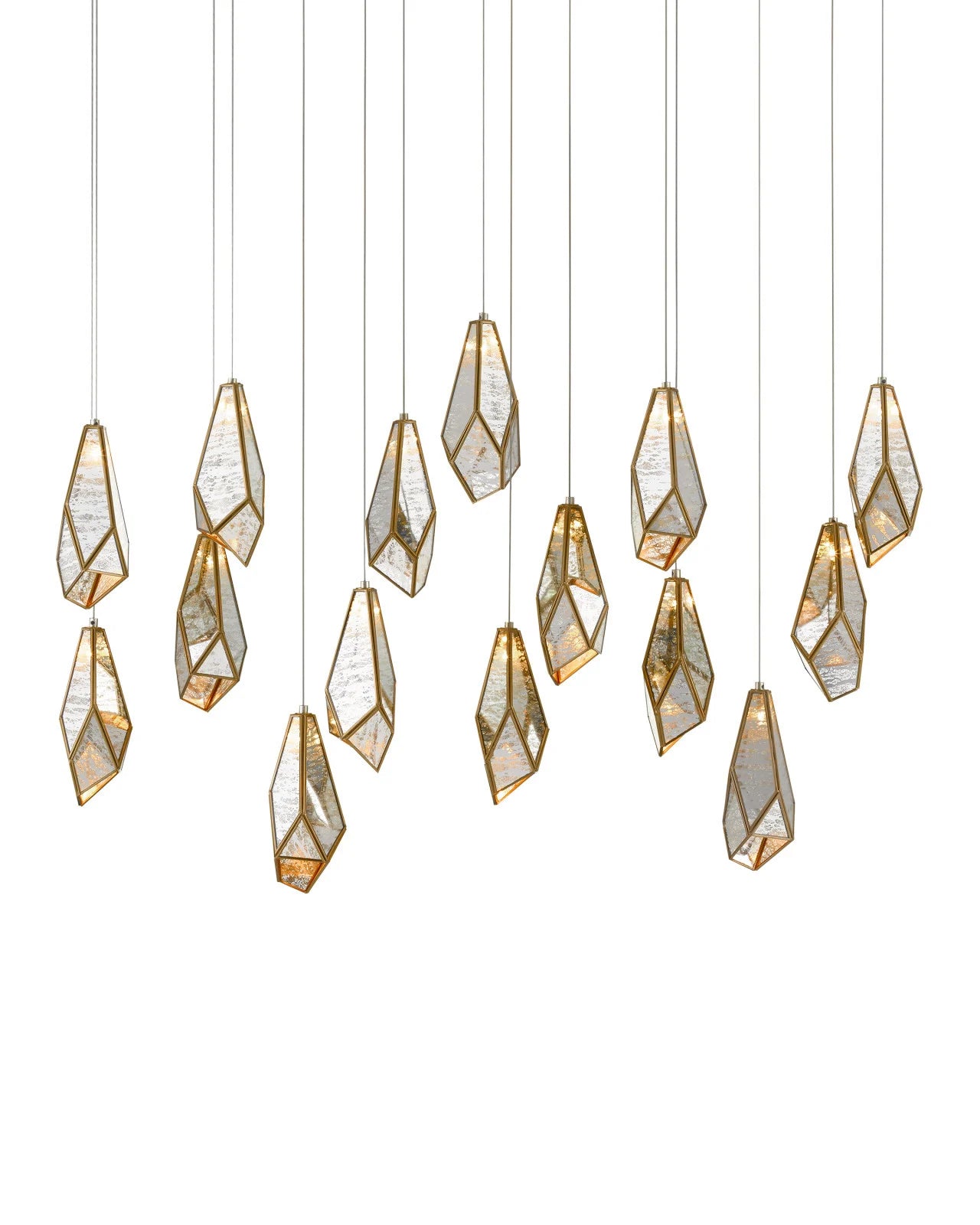 Description: The faceted shades of the Glace Rectangular 15-Light Multi-Drop Pendant are made of panes of Raj mirror joined with seams of metal in a brass finish. The organic shape of the shades and the fact they hang at differing heights brings this mirrored pendant added personality that will make it a piece of jewelry in a space. The canopy of this piece is luminous in a painted silver finish. This fixture is among multi-drop pendant collection, which includes multiple configurations.