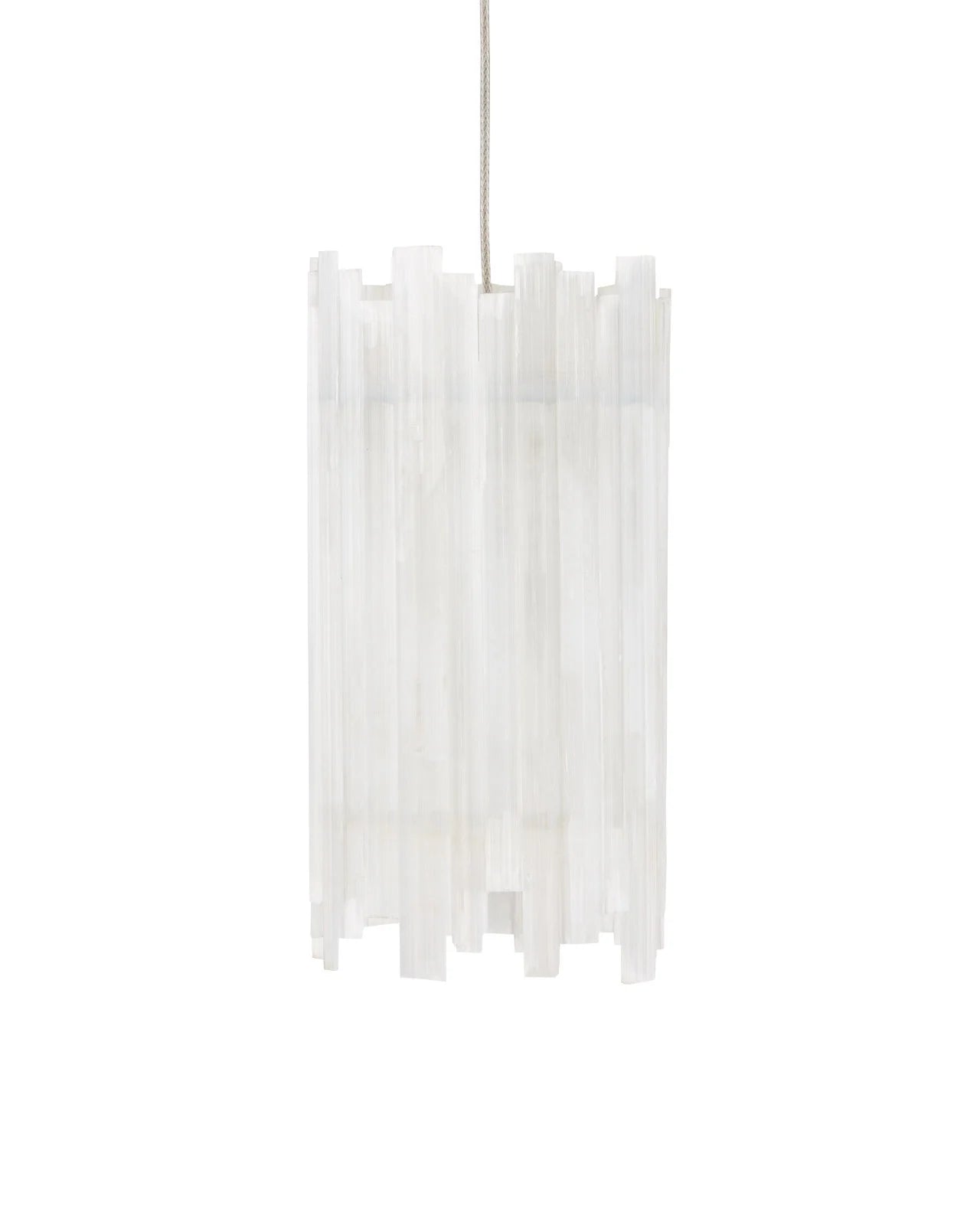Description: The Escenia 1-Light Multi-Drop Pendant has a shade made of natural selenite. The ribs of the essential natural material are staggered top and bottom, which brings the shape of the shade added interest. When the light is switched on, a beautiful glow is created by the crystal bars. The canopy of this piece is luminous in a painted silver finish. This fixture includes multiple configurations.