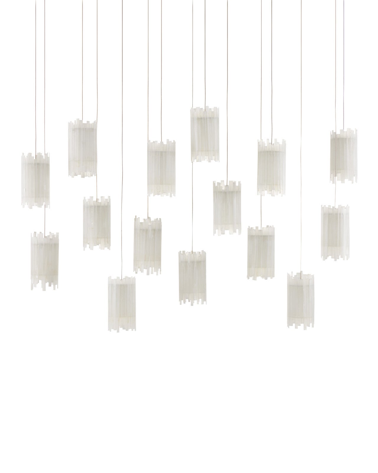 Description: The Escenia 15-Light Multi-Drop Pendant has a shade made of natural selenite. The ribs of the essential natural material are staggered top and bottom, which brings the shape of the shade added interest. When the light is switched on, a beautiful glow is created by the crystal bars. The canopy of this piece is luminous in a painted silver finish. This fixture includes multiple configurations.