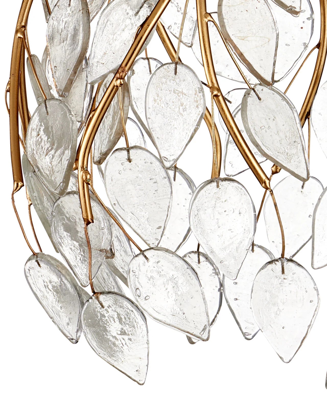 Description: The beautiful 15-Light Linear Multi-Drop Pendant has shades crafted from iron in an antique brass finish with twisting, branch-like forms. Clear glass leaves are set along the curves, their delicate shapes flowing around the bulbs. When illuminated, the glass catches the light, creating shimmer and depth while emphasizing the organic movement of the design. Due to the artisanal material, the surface of the glass could differ slightly on each shade.