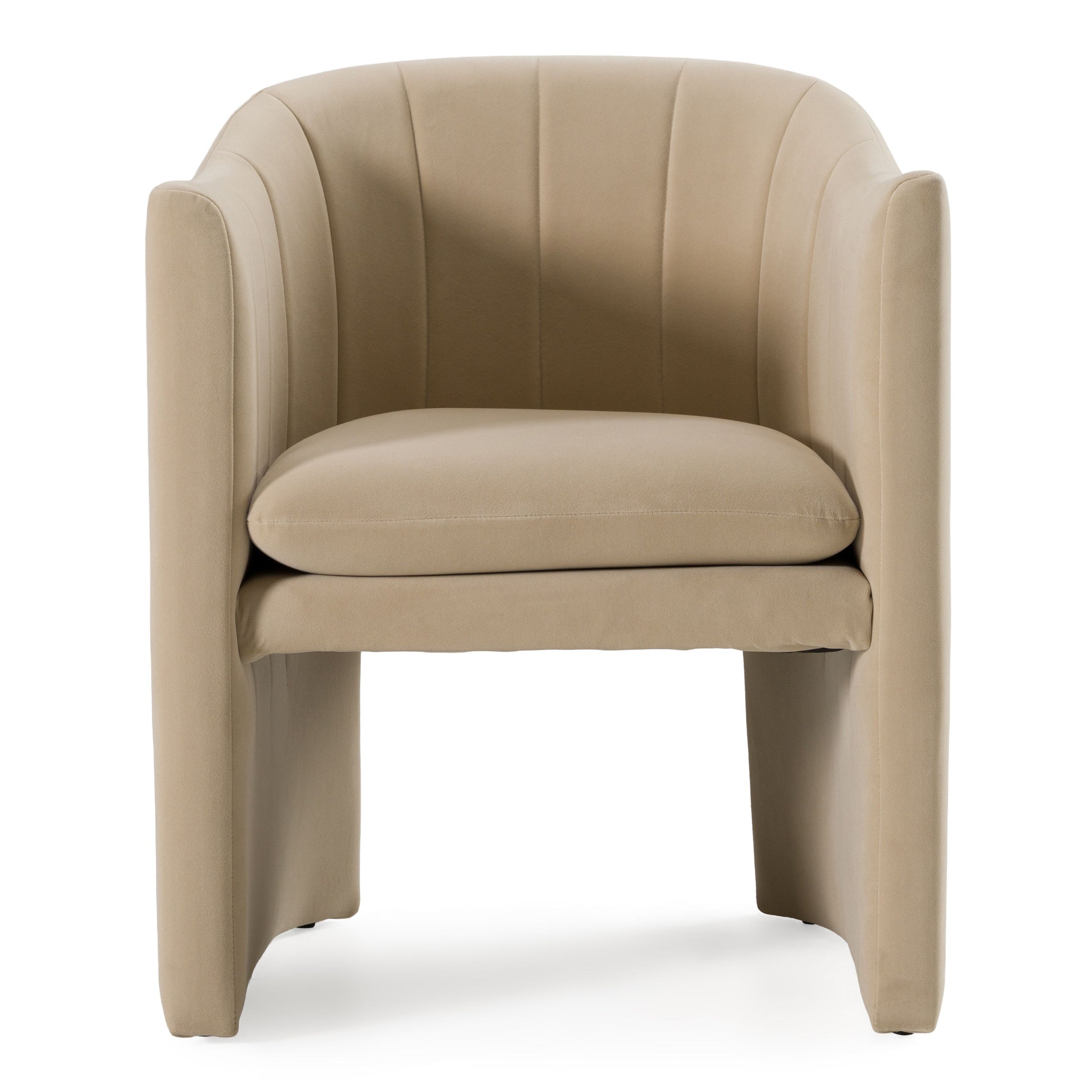 Description: The Akiko Modern Dining Chair is a perfect collection of curvilinear lines and soft Beige velvet upholstery to stimulate the eye of its beholder. The modern shape is offset by the mid-century upholstery. Perfect with a walnut dining table to create a stylish dining experience.