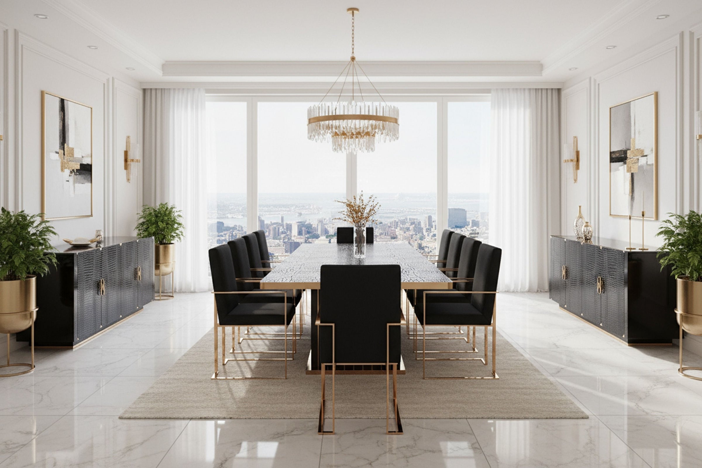 Description: Our gorgeous Delia Modern Buffet is a stunning example of contemporary glam design. The front facing cabinet doors are donning a stylish black high gloss crocodile texture, allowing peeks of the gleaming gold finish. A curvilinear pattern makes up the silhouette of the door handles to create a designer look and feel. Four cabinets with interior shelves can hold a myriad of home items.