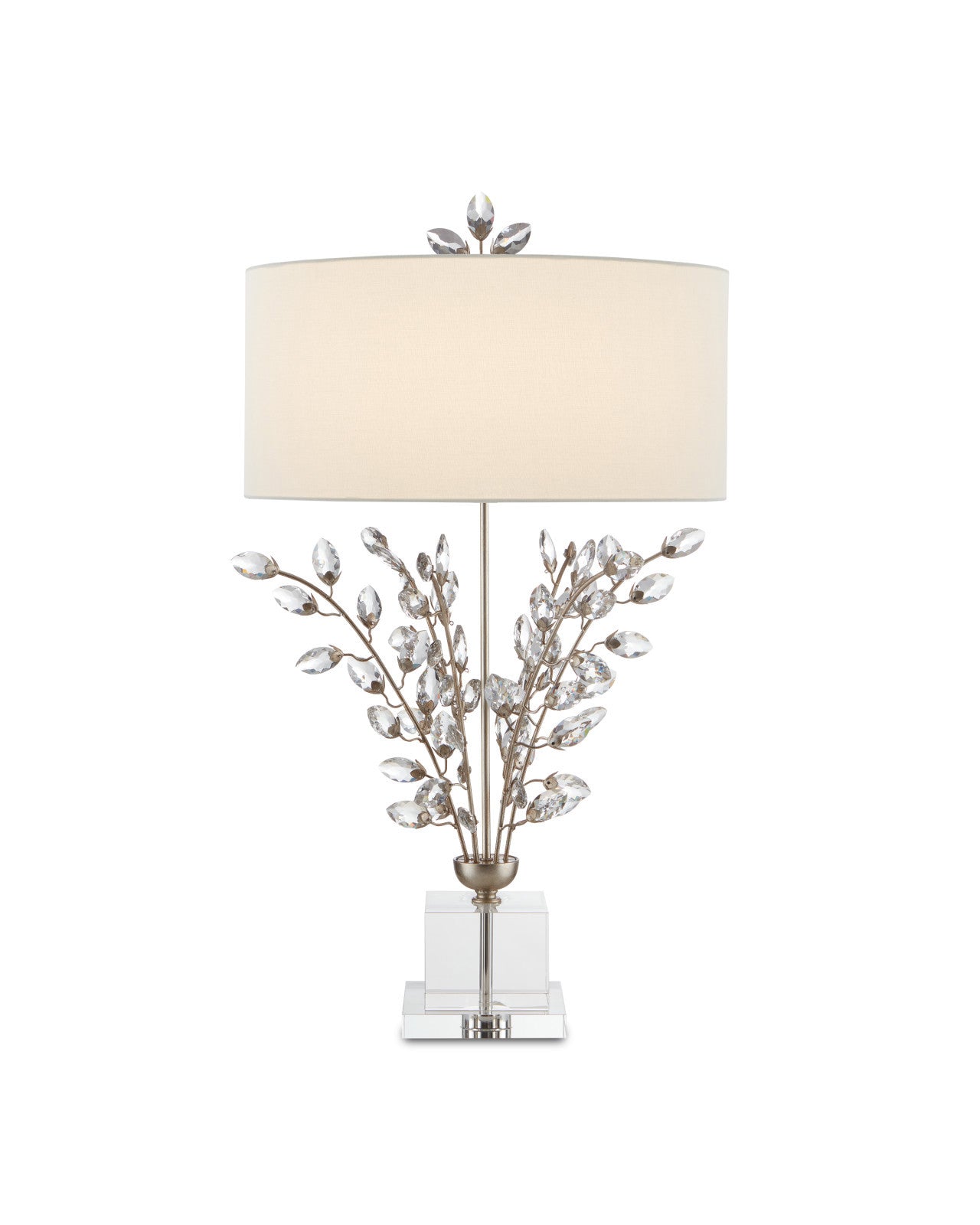 Description: Joining the Forget-Me-Not Table Lamp in gold leaf finish and a black shade is the Forget-Me-Not Silver Table Lamp with gleaming silver leaf-finished stems that hold luxuriant beveled optic crystal buds. Other notable details on this crystal lamp include a crystal finial and stacked base, and a white drum shade in perfect proportion to the spray of crystals. These luminous lamps are beautifully crafted to enhance any space.