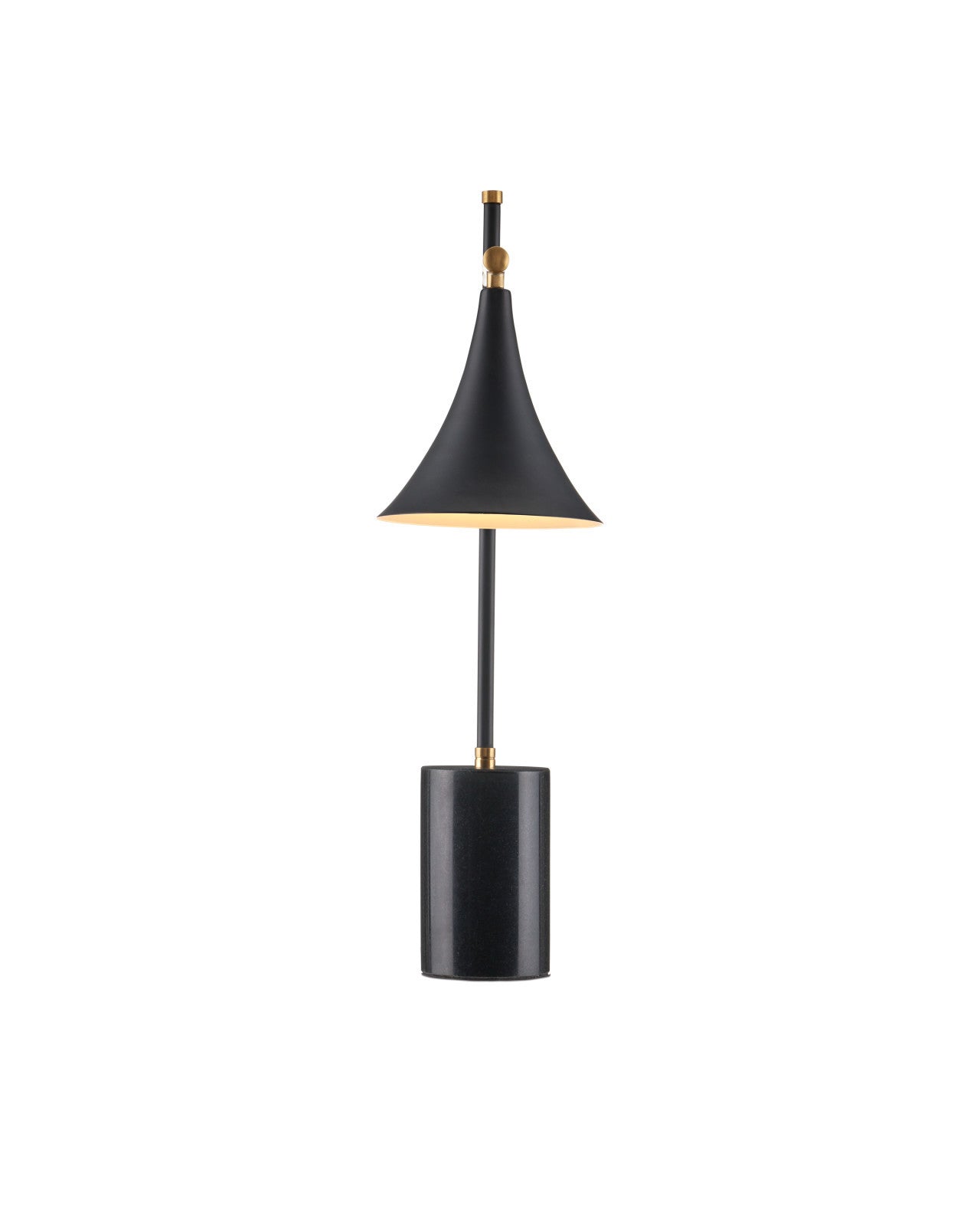 Description: The Odile Table Lamp earns its name with its elegant fluted shade that will cast down-light on the task being undertaken. The thin stem, which rises from a tall cylindrical black marble base, and the shade are in a matte black finish with sophisticated matte brass accents. Though this is a perfect helpmate for a desk, the black table lamp is not adjustable.