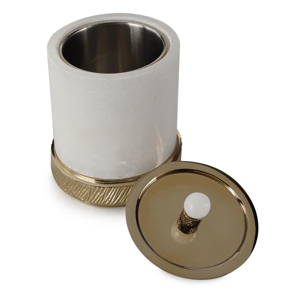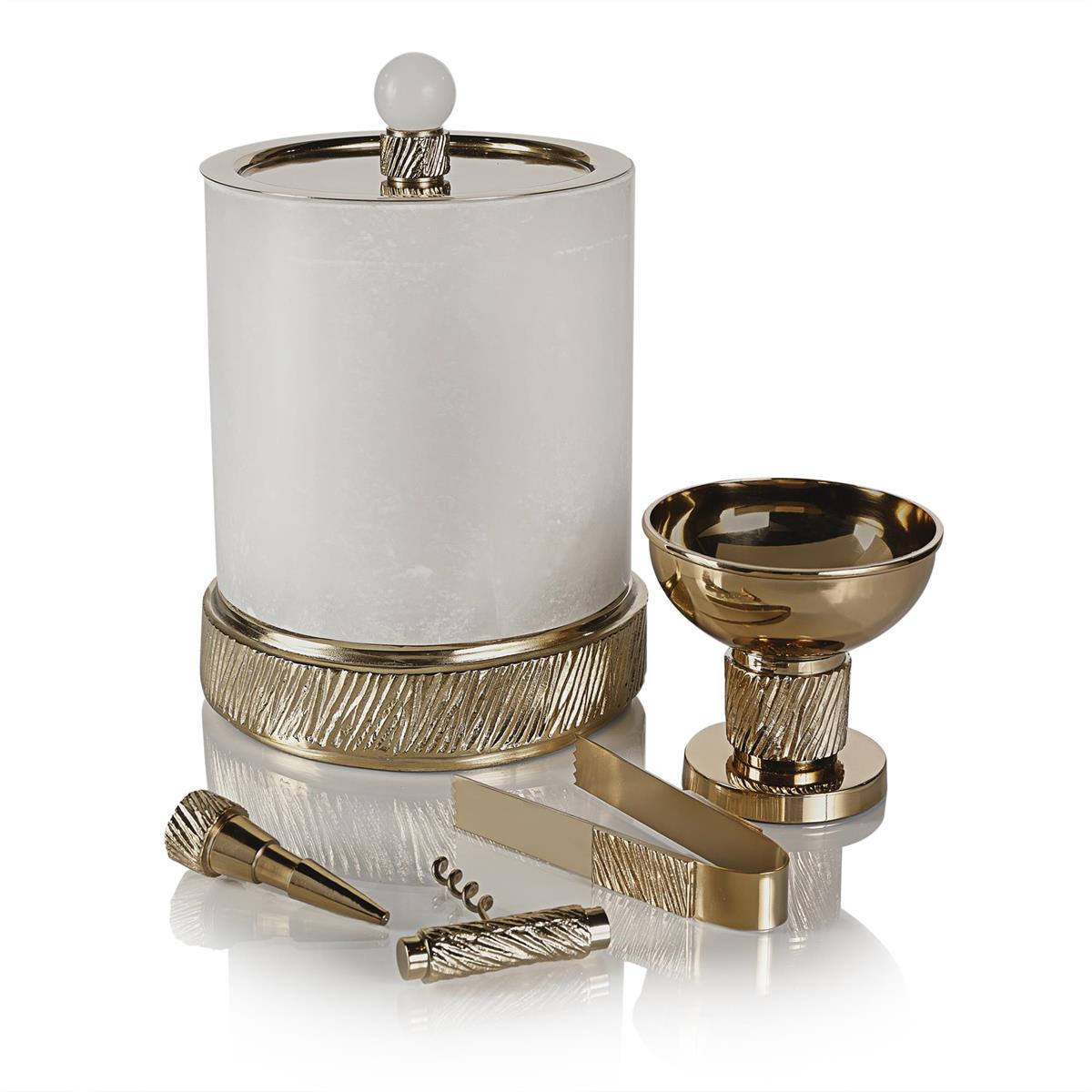 Description: The Bardot Bar Tools set offers a harmonious blend of polished metal and natural stone. The ice bucket pairs a steel basin with a natural alabaster vessel, finished with a brass lid and base in a warm Champagne tone. Coordinating accents define the tongs, wine bottle opener, bar set bowl, and bottle stopper, each featuring subtle textural detailing that enhances their refined character. Together, these pieces create an elegant bar ensemble distinguished by craftsmanship and timeless style.