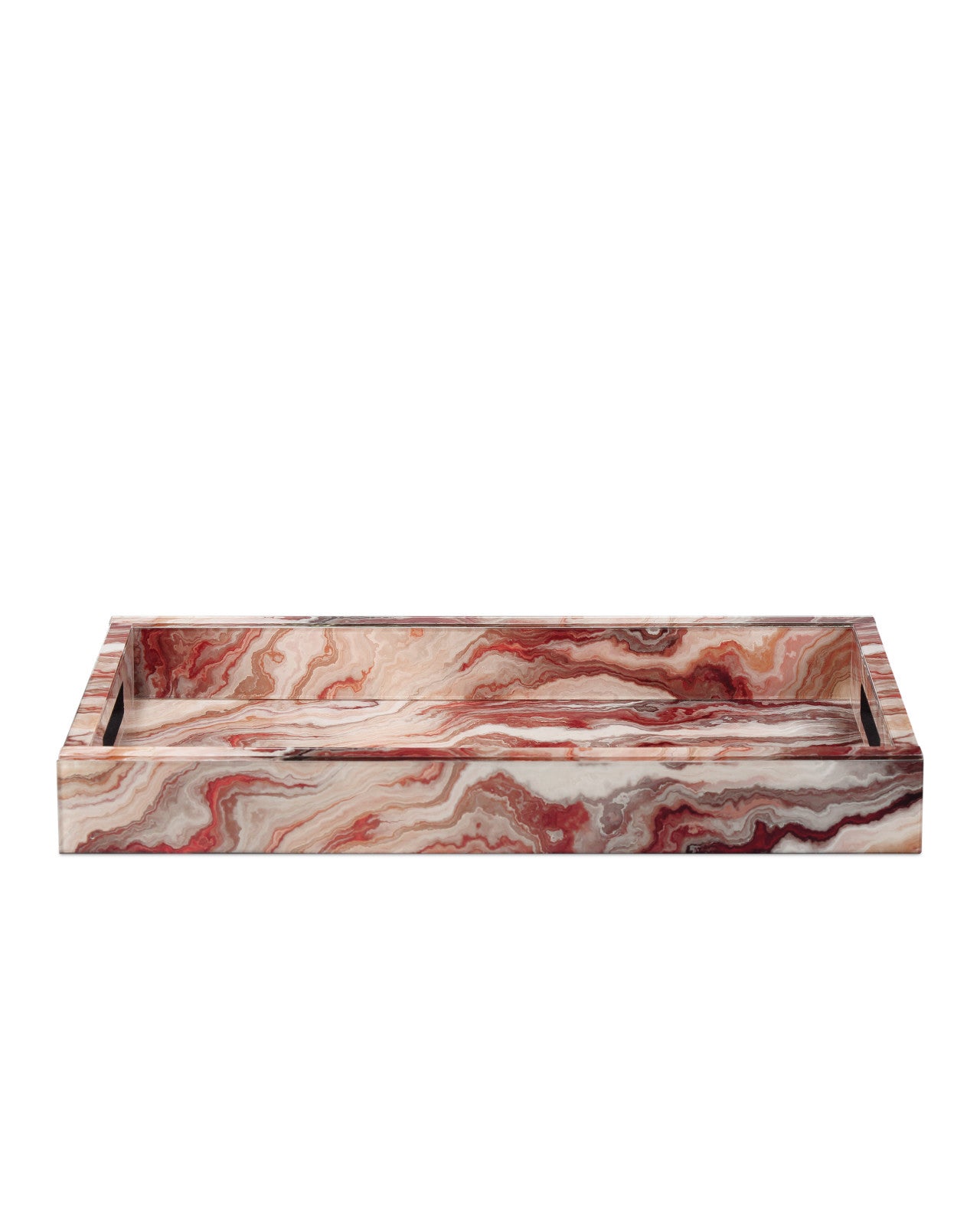 Description: The Celestial Tray has a surprising secret: it is not made of a dynamically patterned stone; its surface was created when red swirl paper was encased in glass. The coating brings the decorative tray an unparalleled sheen. The interiors of the handles are covered in black felt and the bottom is covered in foam. Because this accessory is handmade, the patterns will vary.