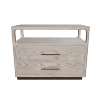 Description: Clean lines lend the Danette Nightstand its minimalist silhouette. Crafted with grey oak veneer that draws attention to the warm brass hardware. An open top shelf provides extra space for added decor.