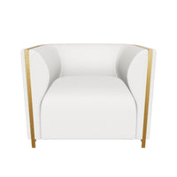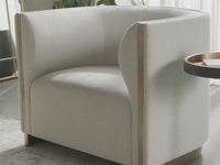 Description:  The Larron Armchair balances mixed materials to bring this contemporary design to life. Expertly upholstered in rhea light barley performance fabric for a soft touch. Gold stainless steel metal inlay and padded curves accentuate the chair's curved silhouette. Performance fabric is moisture repellent, durable and easy to clean.