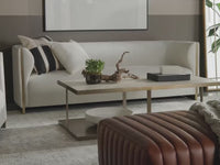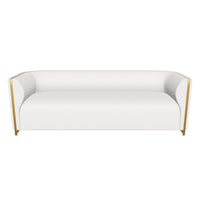 Description: The Larron Sofa balances mixed materials to bring this contemporary design to life. Expertly upholstered in rhea light barley performance fabric for a soft touch. Gold stainless steel metal inlay and padded curves accentuate the chair's curved silhouette. Performance fabric is moisture repellent, durable and easy to clean.