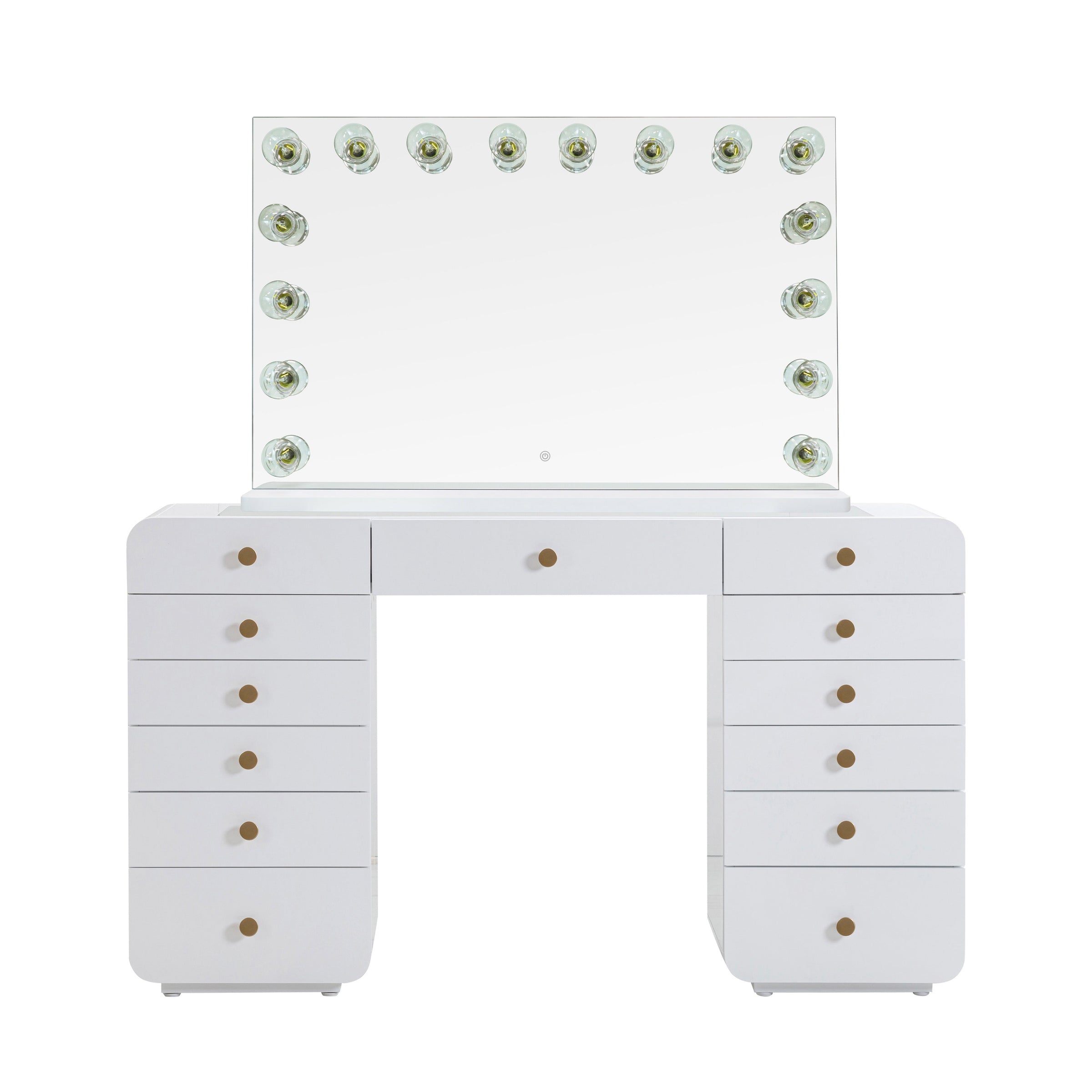 Introducing the Hollywood White Vanity Desk: Your ultimate #GRWM station! Decked out with metal hardware and a top drawer lined for all your treasures, it's perfectly paired with the dazzling Lola vanity mirror for that extra sprinkle of Hollywood glam. This beauty boasts a spacious tabletop mirror to catch that good light, making your makeup pop and those selfies fire while ensuring cleanup is a breeze. With tons of drawers, including some shallow ones, it's all about keeping your products organized and easily accessible. For added versatility, the mirror can easily be disassembled or hung on the wall.