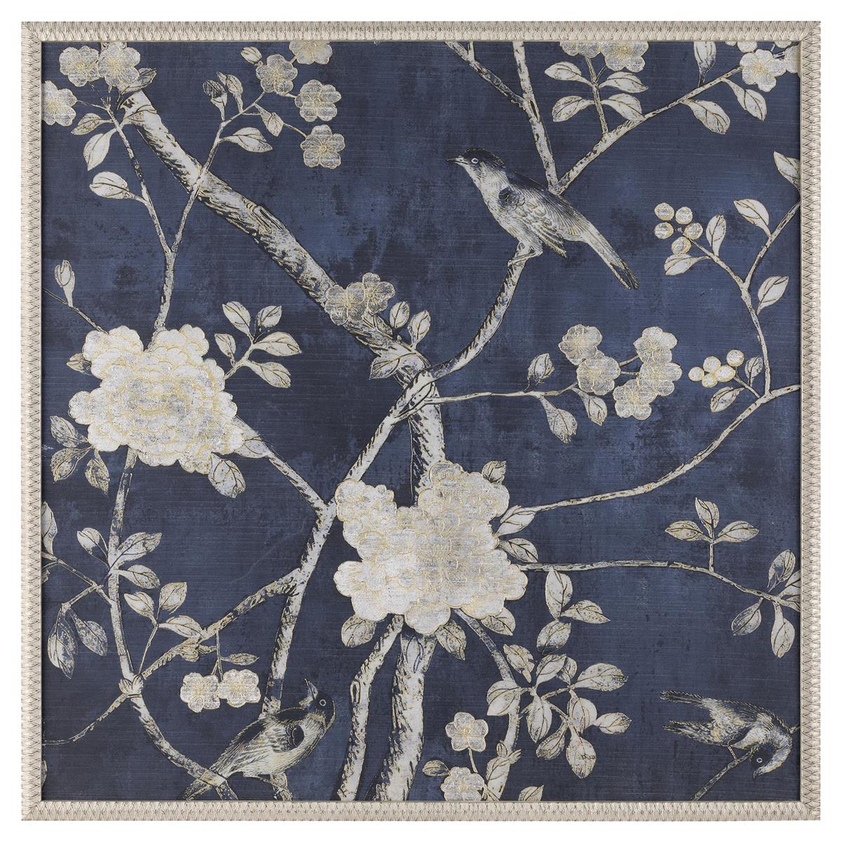 Description: Birds in the Garden is a print on silk depicting a bird perched gracefully among floral branches. Raised gold paint and hand-applied silver leaf accents add dimension and brilliance, beautifully highlighting the composition against a deep blue backdrop. The artwork is presented in a silver gallery frame.
