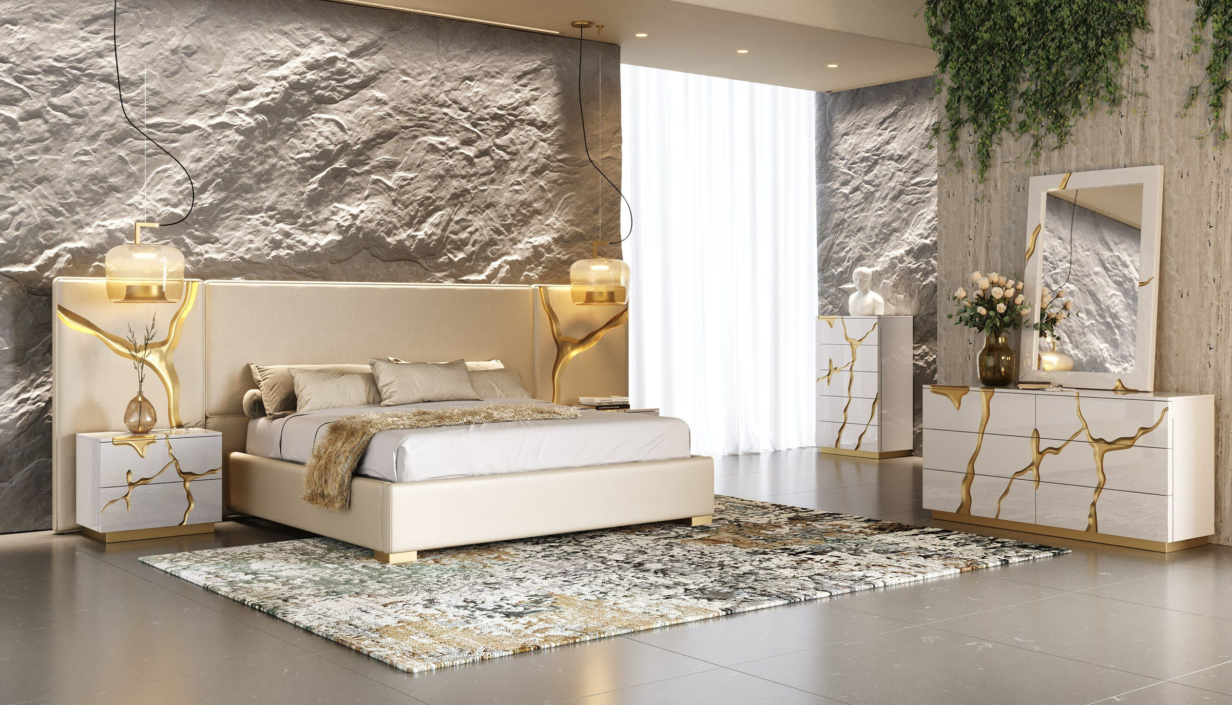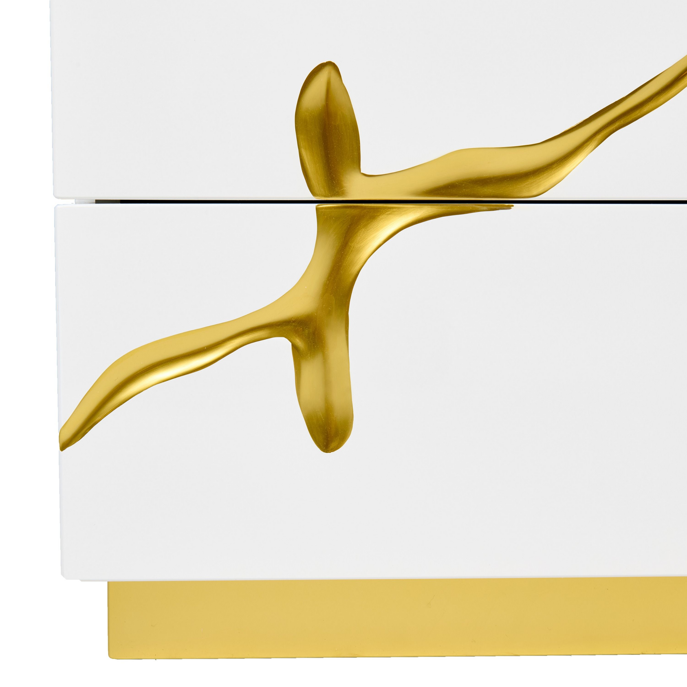 Creative craftsmanship emanates from the Fable Modern White & Gold Nightstand. Featuring a lustrous white high gloss finish, it has two spacious soft-closing drawers with pulls located on its side. Artistic gold-painted accents that simulate tree branches provide visual appeal along with the hefty brown-colored base. Its top is wide enough to accommodate items within easy reach while in bed. Beyond the storage aspect, this fully assembled modern Aspen nightstand lends your bedroom a lavish, stunning look!